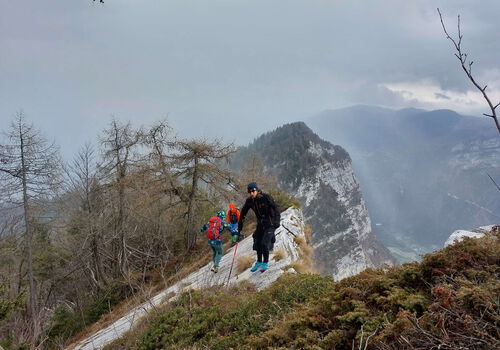 Café, Eisdiele und Pizzeria des nahen Bergdorfes Lamon gewährten Bleibe für den Nachmittag. Eine eher mäßige Wettervorhersage für Sonntag bewegten zu einer gemütlichen Tour von Nordosten auf den Monte Mezza 1678 m, der mit seiner steilen Südwestflanke hoch über dem tief eingeschnittenen Valsunga aufragt. Nachmittägliche Schauer trieben zielstrebig in das benachbarte Dorf Castello Tesino und die örtliche Pizzeria. Auf dem abendlichen Rückweg zum Campingplatz wurde noch die Cima di Campo 1512 m passiert und im Rahmen eines kurzen Nachtspaziergangs das 1909 auf dem flachen Gipfel errichtete Forte Leone erkundet. Der Abreisemontag führte uns ins Valsunga an den Fuß der am Vortag besichtigten Berge für eine Runde Sportklettern an den langen Routen der Falesia di Serafini, für einen schönen Ausklang bei strahlendem Sonnenschein und wohligen Temperaturen.