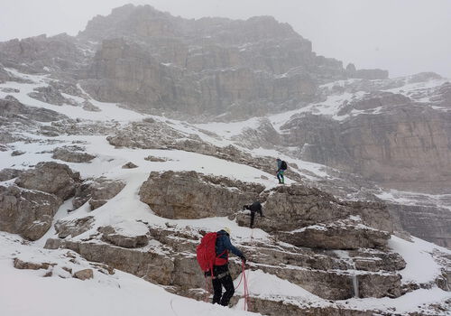 Anfang April wurde zu acht erneut das zu Kurztrips einladende lange Osterwochenende für ein paar Tage Frischluftaktivität genutzt. Mit dem Ziel der Eröffnung der Wandersaison wurden die süddolomitischen Vorgebirge mit ihrer bestechenden Kombination aus schroffen Landschaften, wenig Besuch und etwas höherer Schneegrenze angesteuert. Am Anreisetag wurde ein Zwischenstopp in den westlichsten Dolomiten verabredet, um eine kleine Wanderung auf das zugängliche Weißhorn 2316 m zu unternehmen. Dieses befindet sich am oberen Ende der UNESCO-Welterbe geschützten Bletterbachschlucht, der größten Schlucht Südtirols, in der über 40 Millionen Jahre Erdgeschichte inklusive des größten phanerozoischen Massenaussterbens an der Perm-Trias-Grenze vor 252 Millionen Jahren lückenlos aufgeschlossen sind. Bei klarer Sicht schweifte der Blick über Brenta- und Ortlergruppe, Ötztaler und Zillertaler Hauptkamm bis hin zu den nahen Kalkwänden von Rosengarten und Latemar. Nach der Weiterfahrt über den Rollepass und einem Café in Markt Primör zu Füßen der eindrucksvollen südwestlichen Pala-Türme Cima della Madonna und Sass Maor richtete man sich nachmittags nahe der Stadt Feltre auf einem Campingplatz unterhalb der Nordwestflanke des die venezianische Ebene dominierenden Monte Grappa ein. Am Folgetag wurde sich aufgeteilt für eine Wanderung auf den Monte Coppolo 2069 m und eine winterliche Bergtour auf den abweisenden und auch im Sommer nur selten erstiegenen Sass de Mura 2547 m, höchster Gipfel der Feltriner Dolomiten, über den durch die Westflanke führenden Normalweg. Einige Stunden verfrüht eintreffendes Schneegestöber bewegten jedoch bei beiden Unternehmungen knapp 100 hm unterhalb des Gipfels zu Abbruch und Umkehr.