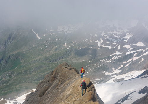 Getrieben von der gewittrigen Wettervorhersage für den Freitagnachmittag begann die Tour bereits um vier Uhr morgens mit der knapp viereinhalbstündigen Anreise nach Osttirol. Großzügig beladen mit Kochutensilien und Verpflegung für zweieinhalb Tage führte der lange Aufstieg von Ströden im hinteren Virgental vorbei an den bei Tagesausflüglern beliebten Umbalfällen und der vom DAV Essen liebevoll bewirtschafteten Clarahütte zu der auf 2677 m gelegenen unbewirtschafteten Kleinen-Philipp-Reuter-Hütte, die trotz ihres leider recht beklagenswerten Zustandes einen zumindest sehr günstig gelegenen Ausgangspunkt für die beiden Folgetage darstellte. Pünktlich gegen 16 Uhr einsetzender und bis weit in den nächsten Vormittag anhaltender Niederschlag gewährte eine lange und erholsame Nachtruhe, sodass man am Samstag erst gegen 11 Uhr zur nahen Rötspitze aufbrach. Bei abklingendem Regen ging es über kurz oberhalb der Hütte ansetzende Altschneefelder hinauf zum Nordnordostgrat, der bei einer sanften Einschartung zwischen Virgenkopf und Unterer Rötspitze unschwierig erreicht wurde. Der landschaftlich sehr lohnende weitere Aufstieg folgt zumeist der Gratkante und führte kurzweilig über einige Steilaufschwünge mit Kletterstellen bis III- und zwei größere Schneefelder im oberen Teil zum herrlich ausgesetzten Gipfelgrat, an dessen Ende bei mittlerweile deutlich aufgelockerter Bewölkung und einzelnen Sonnenstrahlen die Aussicht auf die nahe Hochgebirgsumgebung genossen wurde.