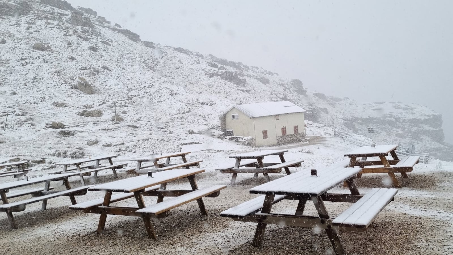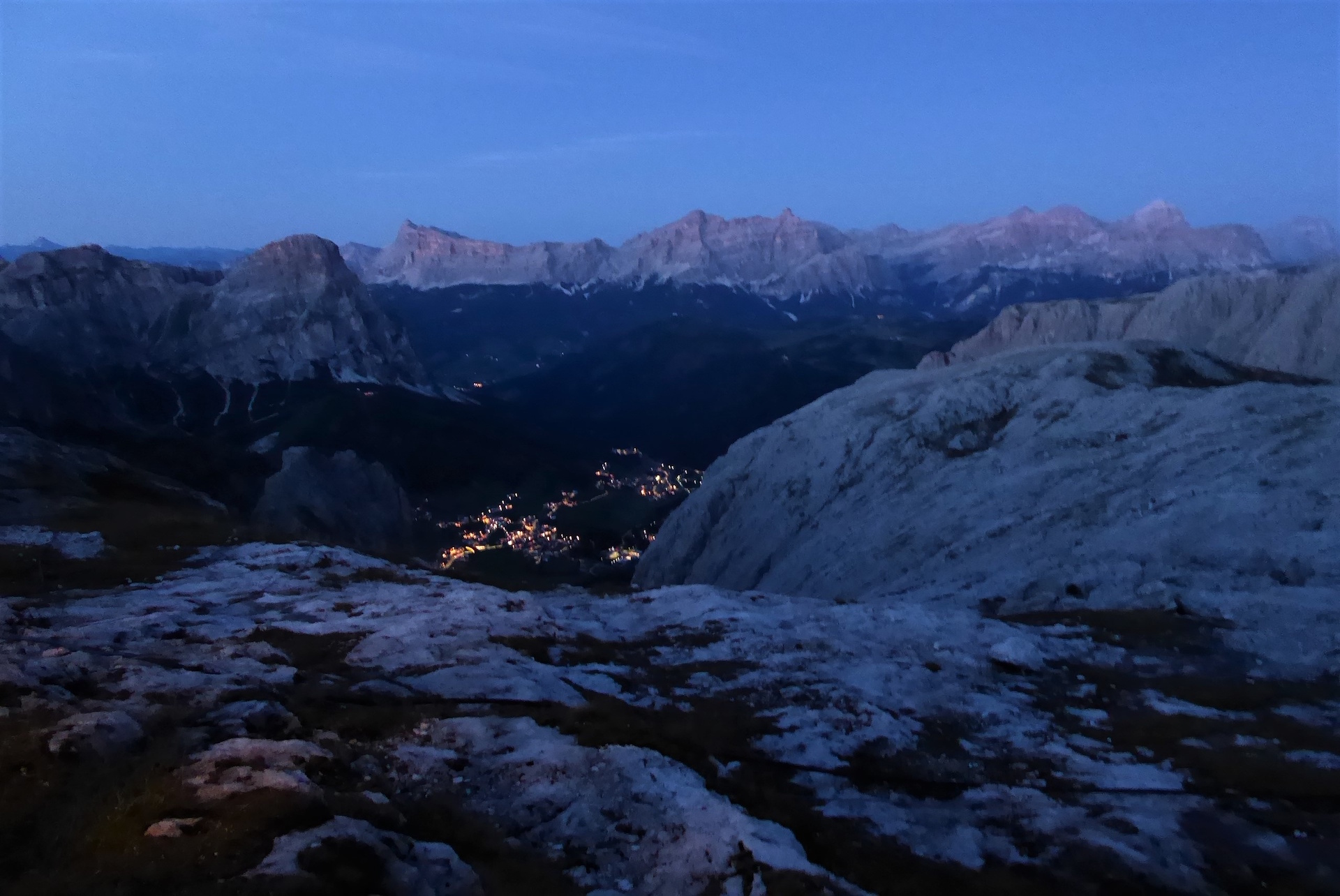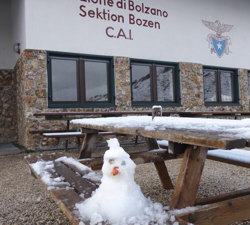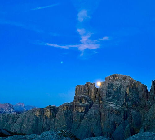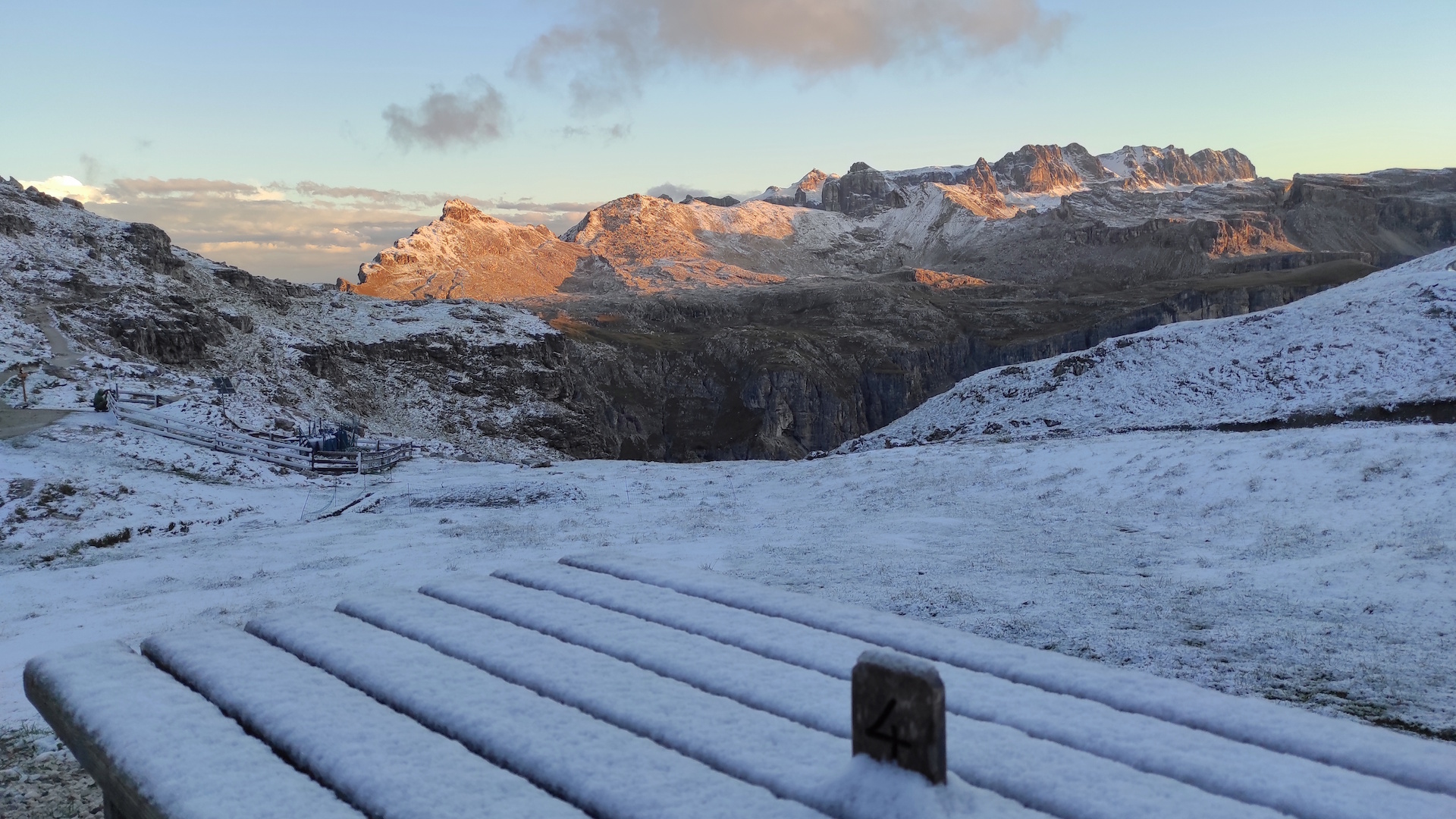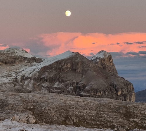 Tatsächlich sind wir keine Sekunde zu früh zurück. Bereits nach kurzem Regenschauer rasen die Wolken mit einer irren Geschwindigkeit um die Hütte. Heftiger Wind zieht auf und es kühlt sehr stark ab. Keine zwei Stunden später erfreut sich die Tochter der Wirtsleute an bestem Schnee und baut vergnügt einen Schneemann auf den Gartenbänken. 3 – 4 cm hat’s geschneit. Die Kaltfront ist durchgezogen. Am Abend reißt die Wolkendecke wieder auf. Sonne und Mond stehen jetzt zeitgleich am Abendhimmel, als wollten sie sich gute Nacht sagen. Ein Wetter- und Naturschauspiel, das fast schon etwas kitschig wirkt. Gegenüber strahlt der Sellastock mit dem Piz Boe im winterlichen Kleid herüber, unten im Tal ist alles grün. Bei derartigen Verhältnissen und Bedingungen verspricht der kommende Tag ein besonderer zu werden.