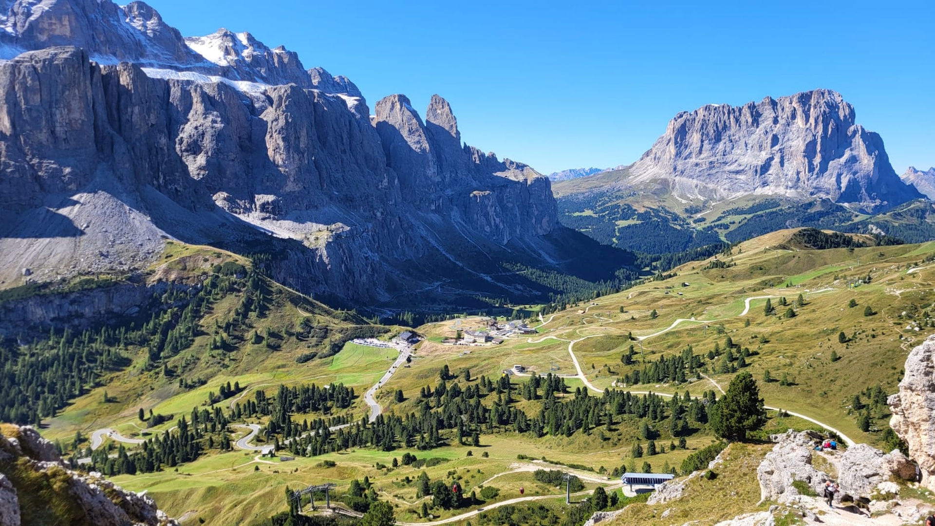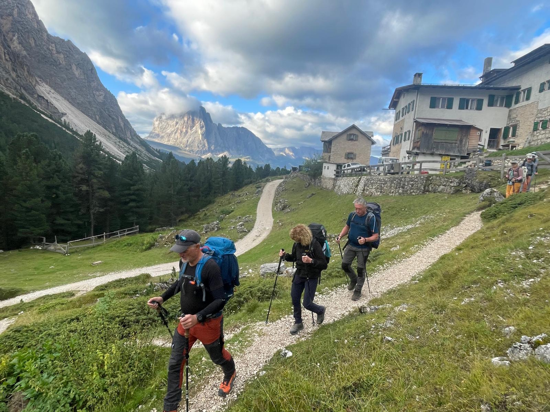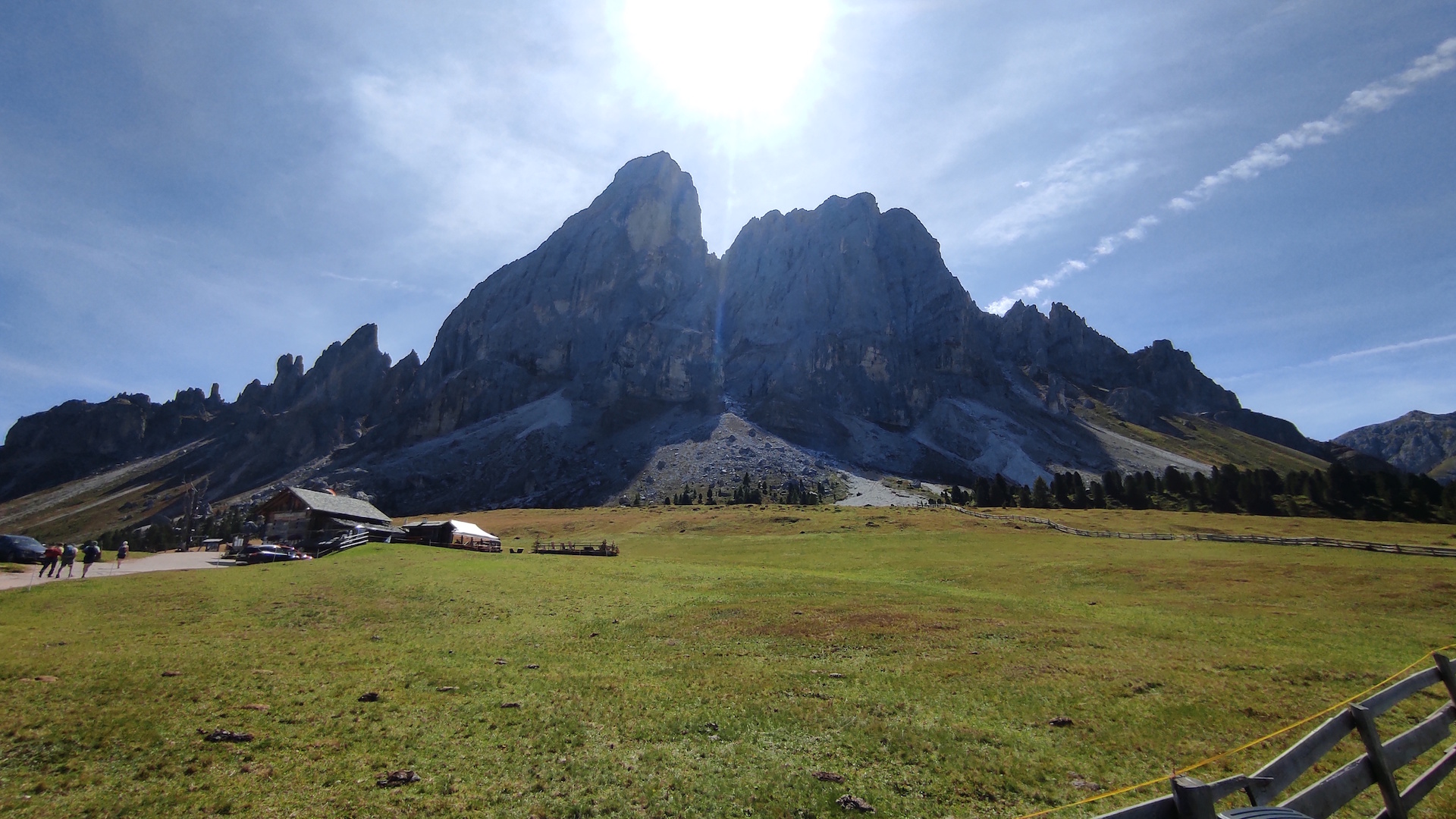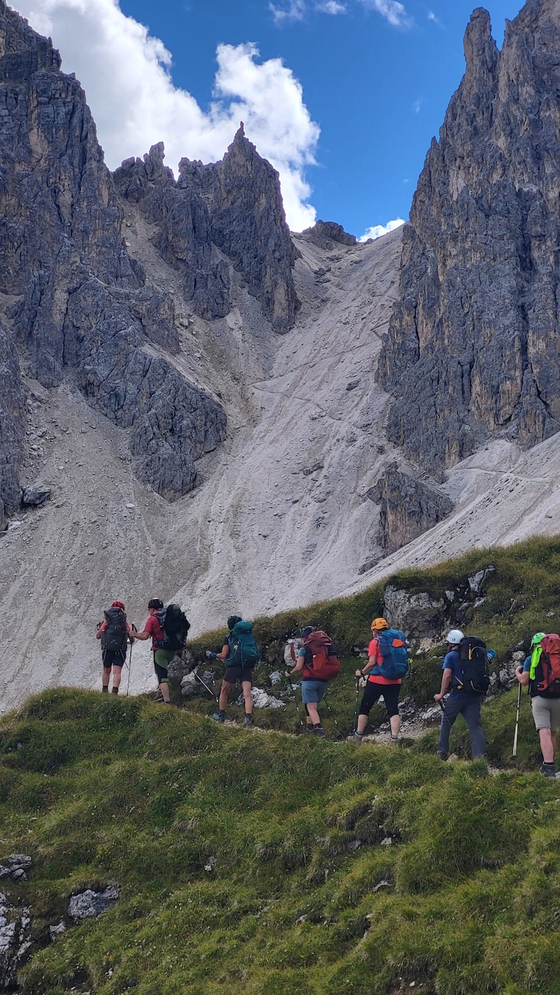 Aufgrund der Brenner Baustelle und der Tatsache, dass noch Ferien sind, startet unsere 18-köpfige Bergsteigergruppe bereits um 03:00 Uhr am Seeweiher Parkplatz. Mit zwei Kleinbussen fahren wir nach Südtirol zum Pordoi Pass am Fuße des Sellastockes. Hier ist auch unser Zielpunkt der fünftägigen Hüttentour durch die Puez-, Geisler- und Sellagruppe. Drei Shuttle Busse chauffieren uns in weiteren 1,5 Stunden zum Ausgangspunkt am Würzjoch.