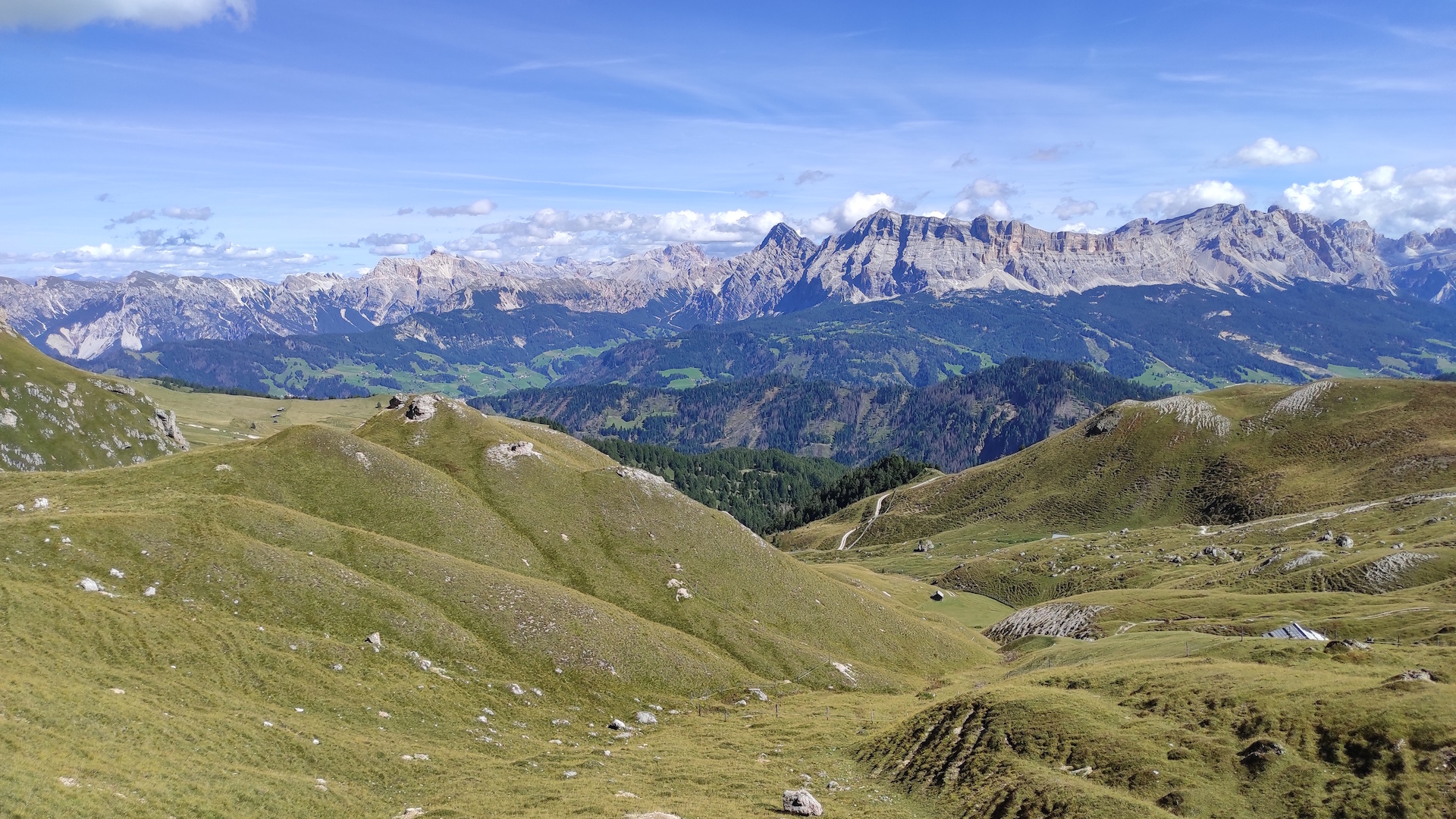 Blick zurück zur Puez - Geislergruppe mit den Cir-Spitzen