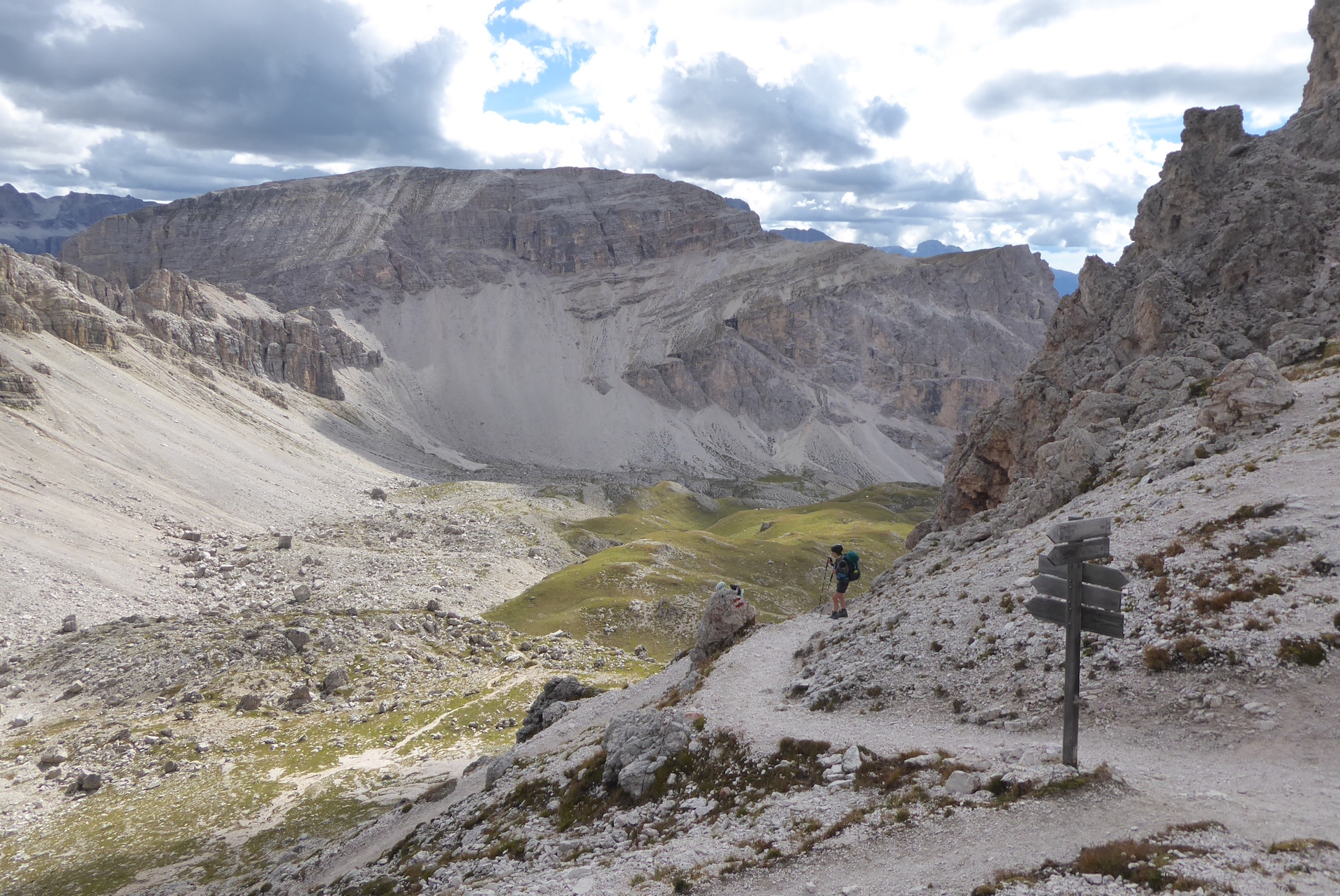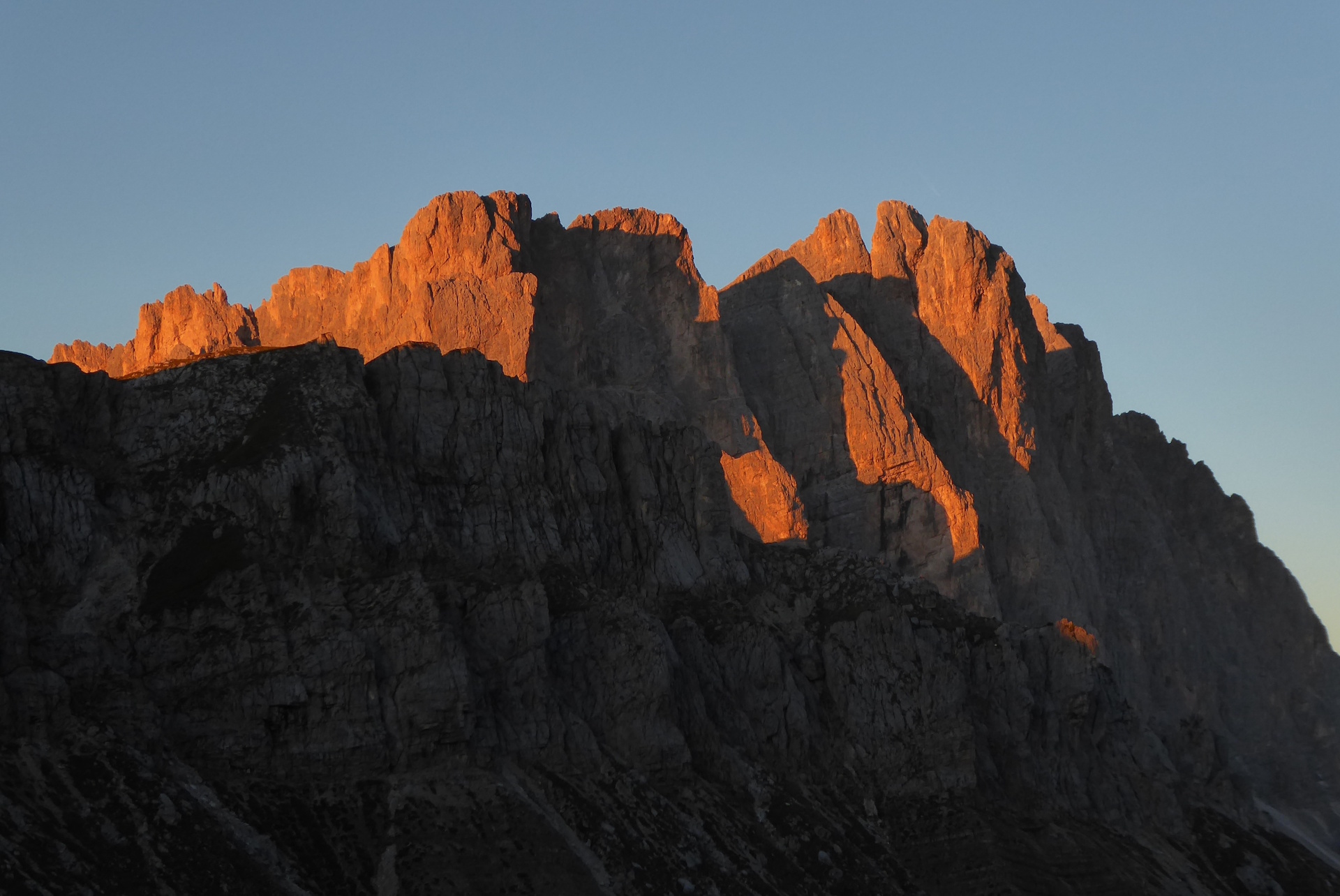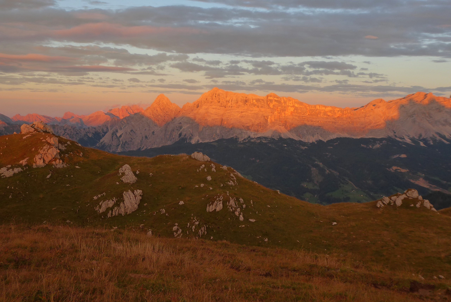 Hoch motiviert starten wir zunächst auf einem Forstweg. Doch schon nach einigen Metern zwingt uns der herrliche Ausblick zum ersten Foto-Stopp. In voller Pracht und Größe steht die über 500 m hohe Nordwand des Peitlerkofels vor uns. Tourenleiter Ralf verneigt sich ehrfürchtig und erklärt, dass dieser Gipfel der Grund sei, warum uns die Hüttentour in diese Region führt. Der Weg wird schmaler und steiler, bis wir schließlich nach vier Kilometern und etwa 550 Hm an der Peitlerkofelscharte ankommen. Hier herrscht reger Betrieb. Aus allen Himmelsrichtungen gibt es Anstiege hier hoch. Bei einer wohlverdienten Rast überlegen wir, ob die Besteigung des Gipfels heute noch sinnvoll ist, sind wir doch bereits seit vielen Stunden unterwegs. „Optional machen wir den Gipfel morgen früh, ohne schweres Gepäck.“. Diese Variante findet rege Zustimmung und so wandern wir „nur“ noch zur Schlüterhütte (2306 m), unserem ersten Etappenziel. Exakt die richtige Entscheidung!! Der Nachmittag und vor allem der Abend mit stimmungsvollem Sonnenuntergang setzen dem sehr gelungenen Tourenauftakt einen würdigen Schlusspunkt. Zudem ist die Schlüterhütte sehr schön und wir werden auch kulinarisch verwöhnt – Bergsteigerherz – was willst du mehr?