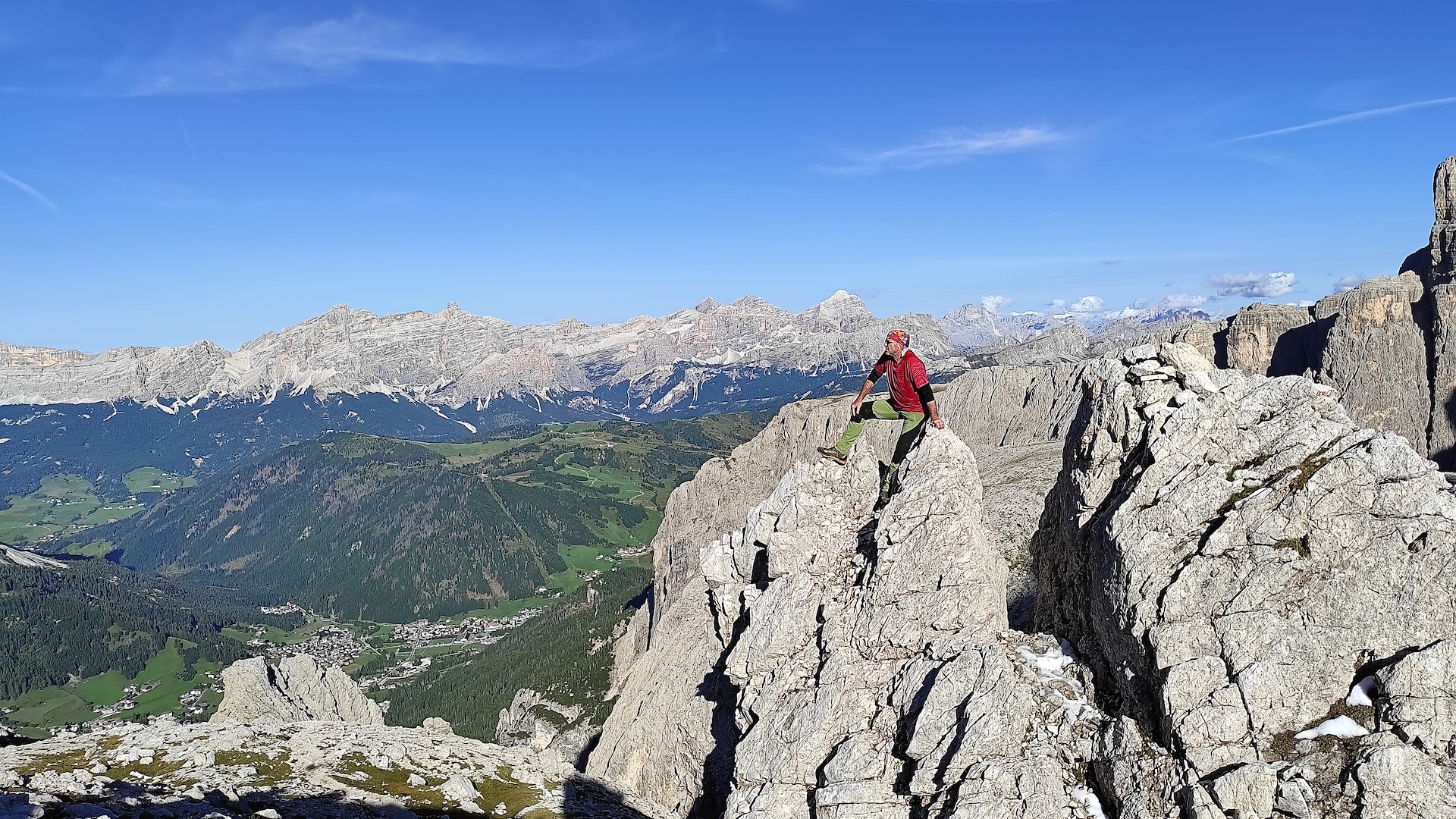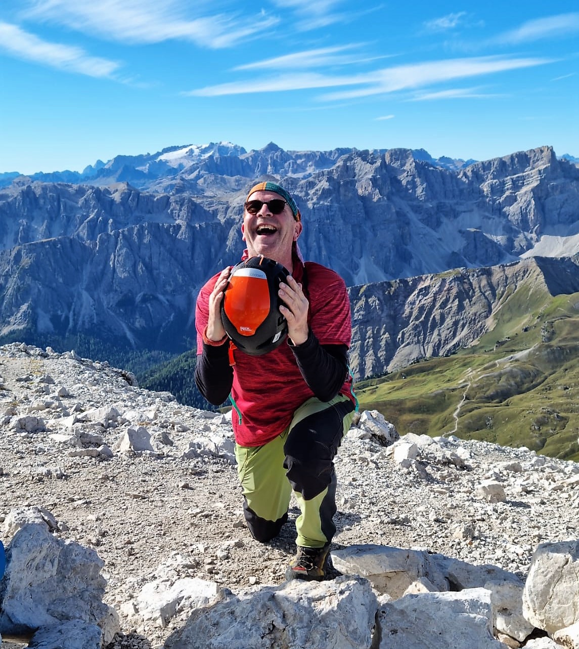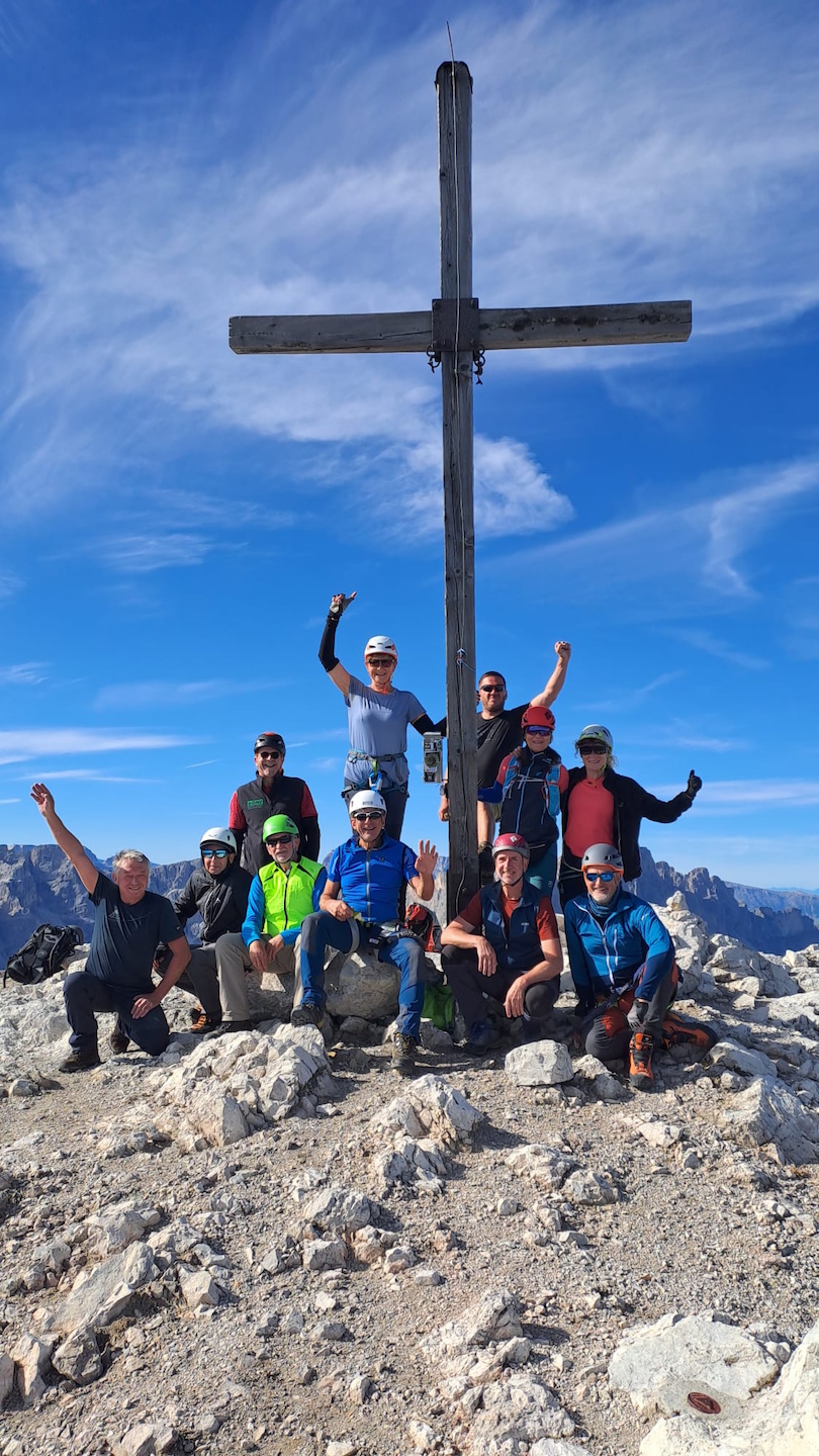 Frühstück 07:00 Uhr – Abmarsch spätestens 08:00 Uhr - das ist die Ansage für die Gipfelaspiranten. Schließlich steht heute ein Besuch bei „seiner Majestät“ dem Peitlerkofel auf dem Programm. Und da wollen wir doch einen guten Eindruck hinterlassen!! Bis zur Scharte ist uns der Zustieg bereits bekannt – sollte man zumindest glauben! Mit kleinem Umweg finden wir diese dann auch. Ab hier wird es deutlich steiler und etwas anspruchsvoller. Auf einem gut ausgebauten Felssteig arbeiten wir uns schwitzend in die Höhe. Von der Scharte zum Gipfel sind es doch nochmals über 500 Hm. Am Punkt 2750 m muss sich jeder Einzelne nun entscheiden, ob er den leichten Klettersteig zum Hauptgipfel auf 2875 m oder den einfacheren Wanderweg zum „Picia Putia“, dem „kleinen Peitlerkofel“ auf 2813 m gehen will. Egal – das 360° Panorama ist von beiden Plätzen so traumhaft schön, dass man es mit keinen Worten beschreiben kann. Wir sehen einfach alles, was in den Ostalpen Rang und Namen hat. Einigen von uns fehlen die Worte, andere nehmen den Helm ab und verneigen sich vor diesem Paradegipfel! Ein wahrhaftig unvergesslicher Moment in jedem Bergsteigerherz.