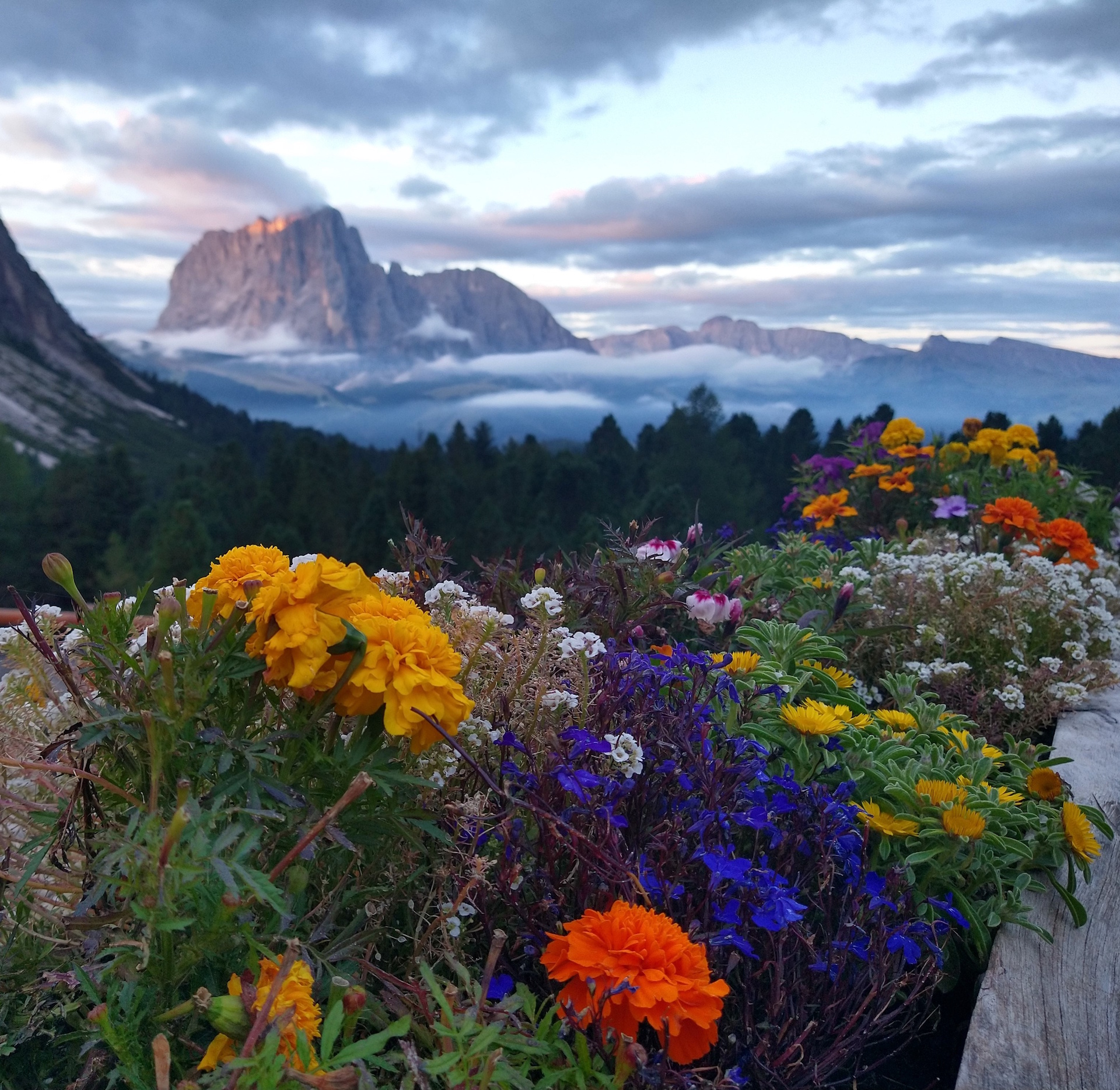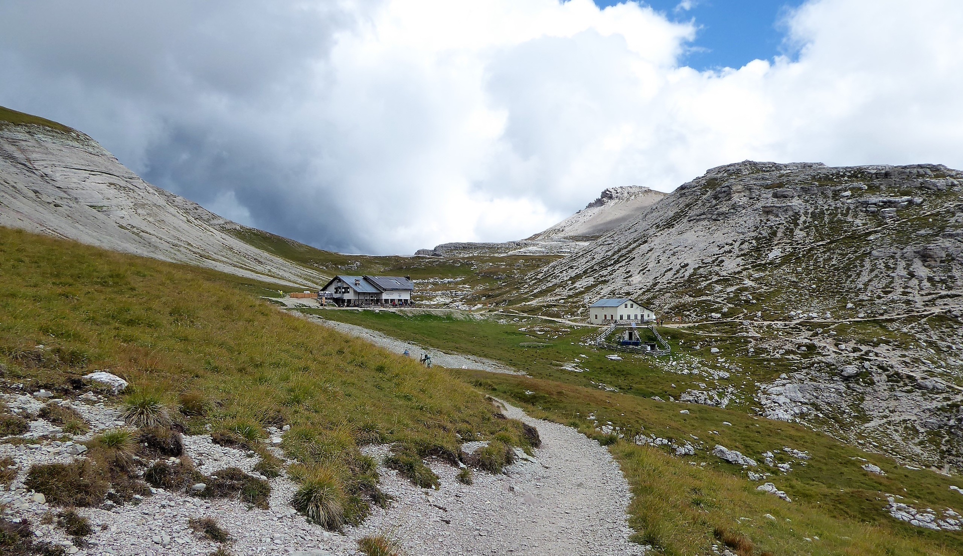 Der morgendliche Blick aus dem Fenster ist zweifelhaft. Einerseits herrscht eine unbeschreibliche Sonnenaufgangs- und Wolkenstimmung, andererseits verheißen die Nebelschwaden nichts Gutes. Beim Frühstück entscheiden wir uns, aufgrund der heutigen Wetterprognosen, für eine kürzere Variante zum nächsten Tagesziel, der Puezhütte. Auf dem Dolomiten Höhenweg 2 wandern wir über steiles, felsiges Terrain. Einige Steilstufen sind seilversichert. In diesem Gelände zwischen 2600 m – 2800 m kann ein plötzlich einsetzender Regenschauer fatale Folgen haben. Deshalb wählen wir den direkten Weg zum Schutzhaus. Unterwegs auf der Hochfläche der Puezalm öffnet sich der fantastische Blick hinunter ins „Langental“ bis nach Wolkenstein und St. Christina im Grödnertal. Bei manchen Panoramen zweifelt man an der Echtheit, so malerisch schön sind sie. Bereits um die Mittagszeit erreichen wir unser Ziel. Da das Wetter anscheinend doch noch etwas länger aushält, erkunden wir, nach einer ausgiebigen Kaffeepause, die nähere Umgebung der Hütte, immer bereit für einen raschen Rückzug, im Falle eines Unwetters. Diesen Rat gibt uns der Bergführer und Hüttenchef mit auf den Weg. „Die Gipfel lasst ihr heute Nachmittag lieber sein!“ warnt er pflichtbewusst.
