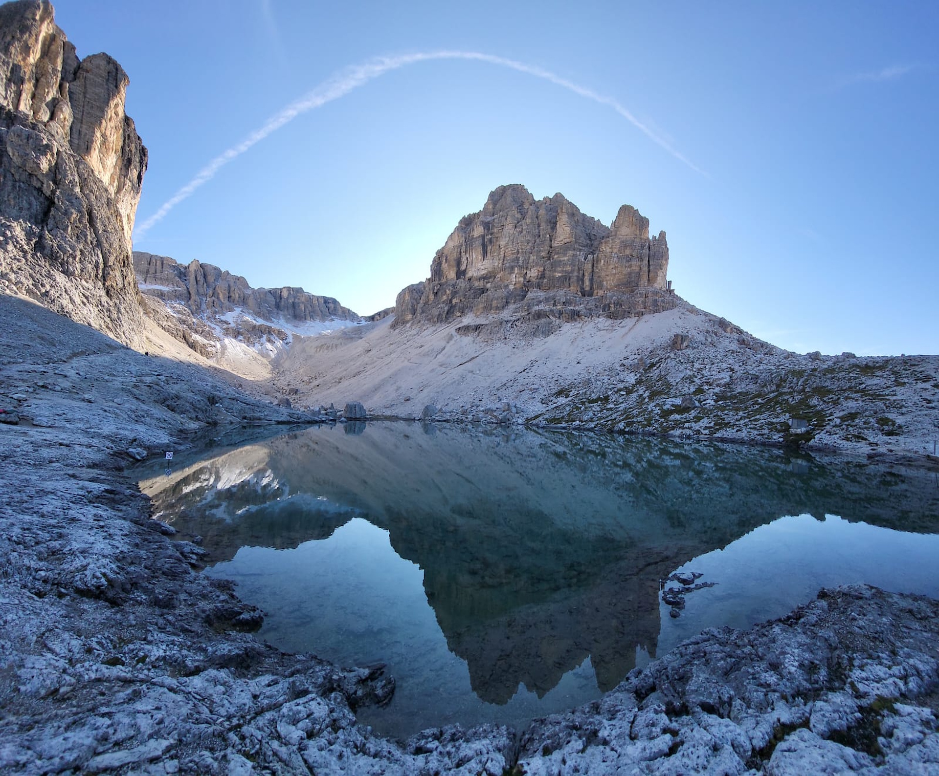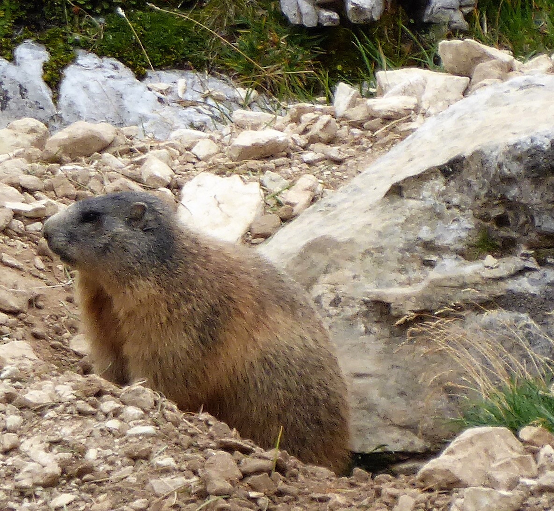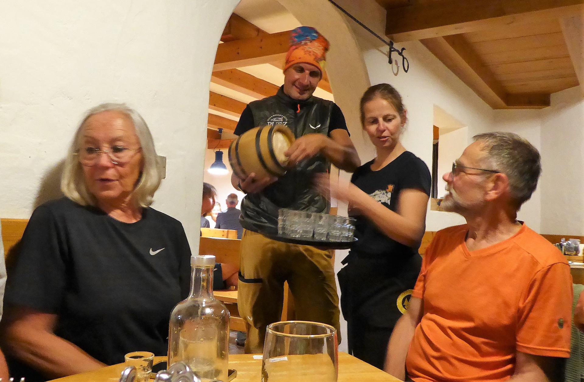10 Minuten später sitzen wir auf der herrlichen Terrasse der „Pisciadu Hütte“ auf 2587 m und lassen es uns richtig gut gehen. Die Nachmittagssonne wärmt wohltuend die müden Knochen und manch einer lässt sich eine Abkühlung im nahe gelegenen See nicht entgehen. Zu allem Glück endet der sowieso schon fast perfekte Tag noch mit Gitarrenmusik und vielen bekannten Liedern in der Gaststube – es gibt also doch ein „fast perfekt“!!