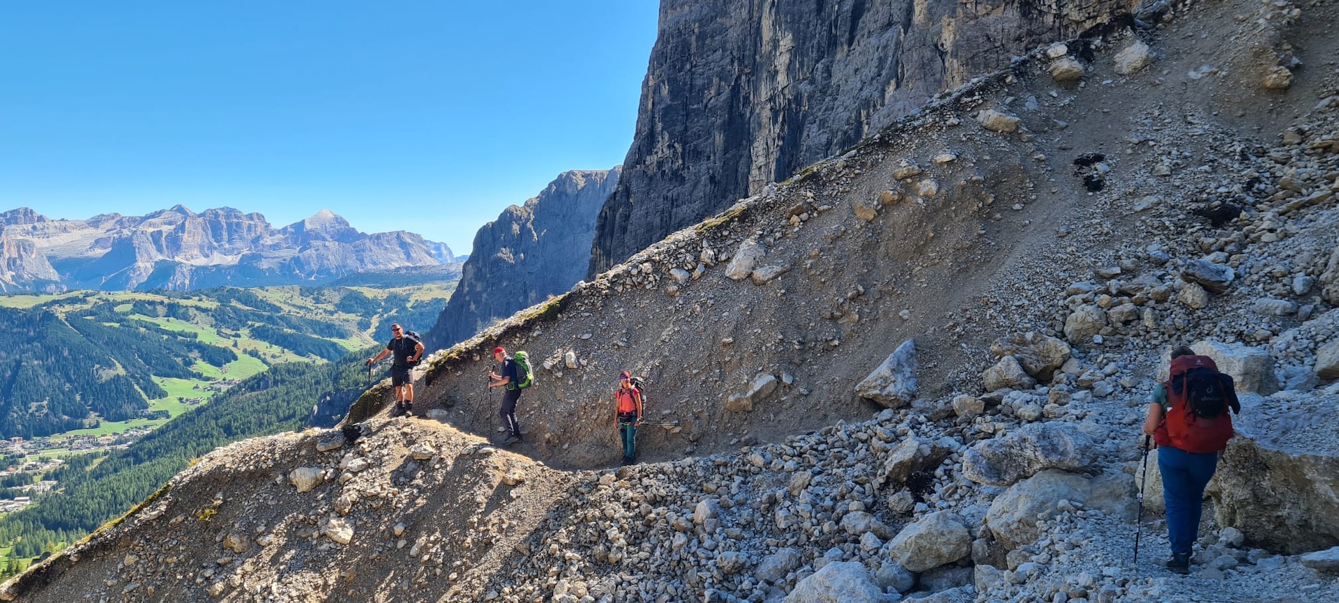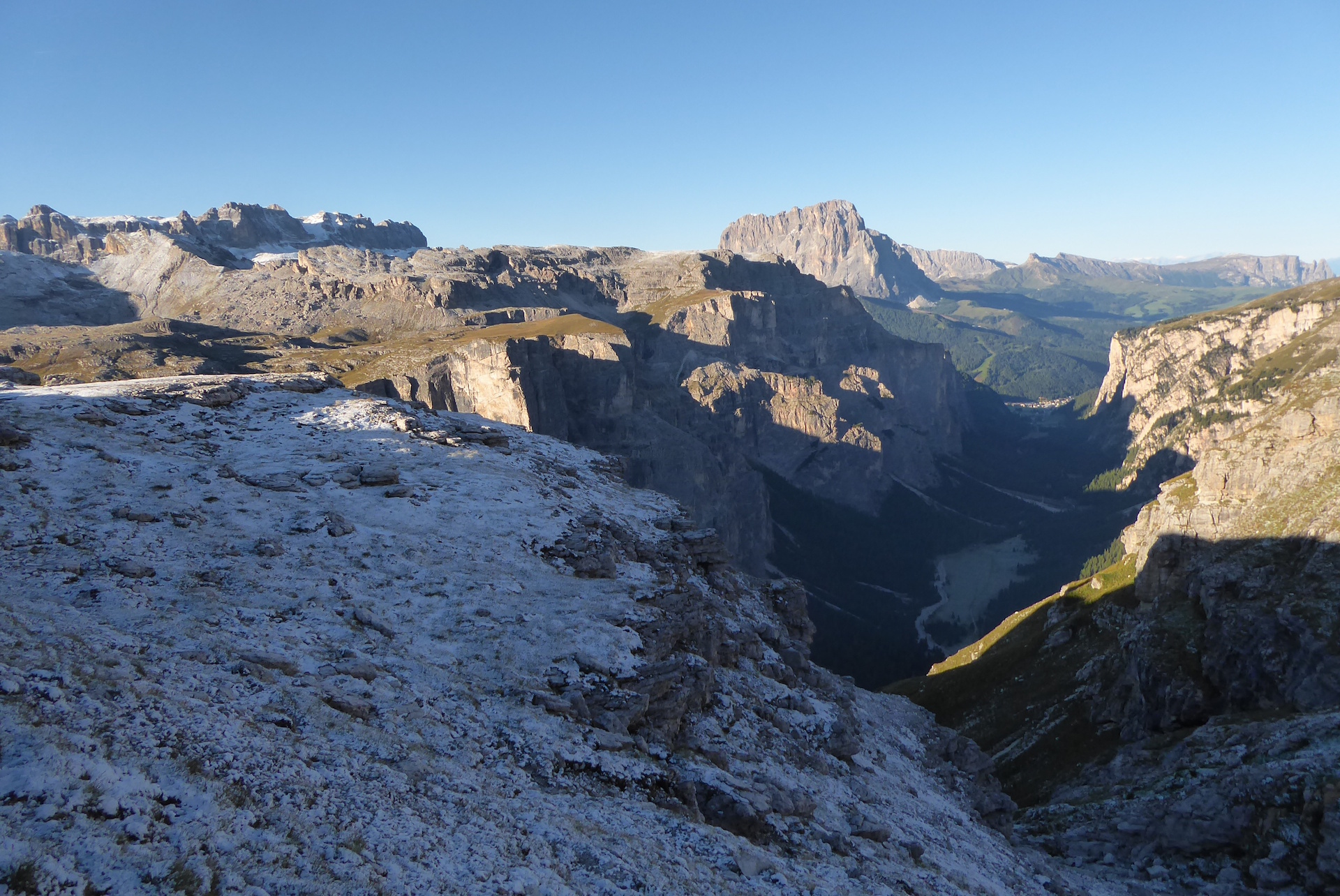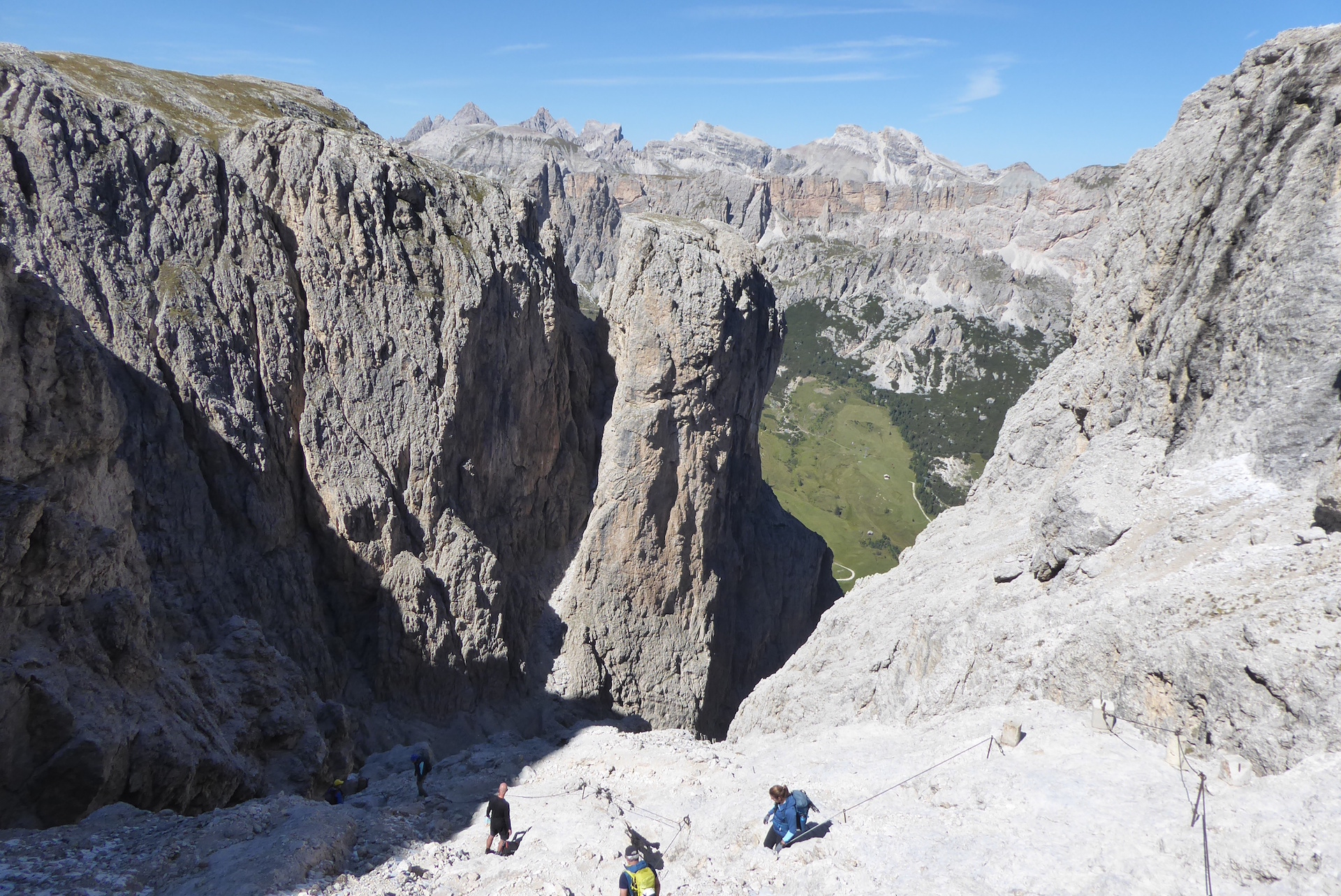 Kalt, aber wolkenlos und sonnig. So begrüßt uns der nächste Morgen. Die Wege sind schneefrei und die Bedingungen könnte kaum besser sein. Zum Glück führt der Weiterweg zunächst relativ höhengleich über die Puez Hochfläche nach Süden zum „Crespeinajoch“ auf 2528 m, was wir nach etwa zwei Stunden erreicht haben. Welche Kraft die Sonne hat, spüren wir beim folgenden Abstieg, der im Schatten einiger Steilwände verläuft. Freiwillig setzen wir Mütze und Helm auf. In den folgenden 600 Hm Abstieg zum Grödner Joch, fühlen wir uns stellenweise wie in einem Felsenlabyrinth. Spannend schlängelt sich der Weg durch die steinigen Türme. Allerdings wird beim bergab gehen sehr deutlich, dass der Großparkplatz Grödner Joch nicht weit weg sein kann. Es herrscht beinahe so Hochbetrieb wie am Stachus in München. Rasch überqueren wir die Passhöhe und biegen direkt hinter dem Parkplatz ab. Kurz darauf sind wir auch schon wieder fast alleine auf dem Pfad unterwegs. Jetzt liegt die Puez – Geislergruppe gegenüber von uns und wir bestaunen die zackigen Cir-Spitzen und unseren Abstiegsweg. Von nun an bewegen wir uns im Sella Massiv. Einige Teilnehmer haben bereits seit Beginn der heutigen Etappe ein flaues Gefühl im Bauch, denn nun bewegen wir uns auf die Schlüsselstelle der gesamten Hüttenrunde zu. Wir müssen durch das „Val Setus“ hinauf zur Pisciadu Hütte. Dabei handelt es sich um eine Steilrinne, die auf einer Strecke von einem Kilometer eine Höhe von 500 Hm überwindet und teilweise über 45° steil und seilversichert ist. Aufgrund von häufigem Steinschlag wurde die Aufstiegslinie im oberen Bereich wie ein leichter Klettersteig A/B in den massiv gewachsenen Felsen angelegt. Es erweist sich als eine sinnvolle Routenführung ohne größere Schwierigkeiten. Schwindelfrei und trittsicher sollte man aber schon sein!! Leider müssen wir auch hier erschreckend feststellen, wie viele unvernünftige Touris es gibt, die in so einem Gelände aufgrund mangelnder Ausrüstung absolut nichts verloren haben!! Wir lassen uns den Spaß aber nicht verderben und genießen jeden Meter des „empor kraxelns“. Am Ausstieg erwartet uns abermals ein Panorama, das seines Gleichen sucht. Ralf blickt in ausnahmslos glückliche Gesichter, ja sogar die eine oder andere Freudenträne kullert über manche Wangen.