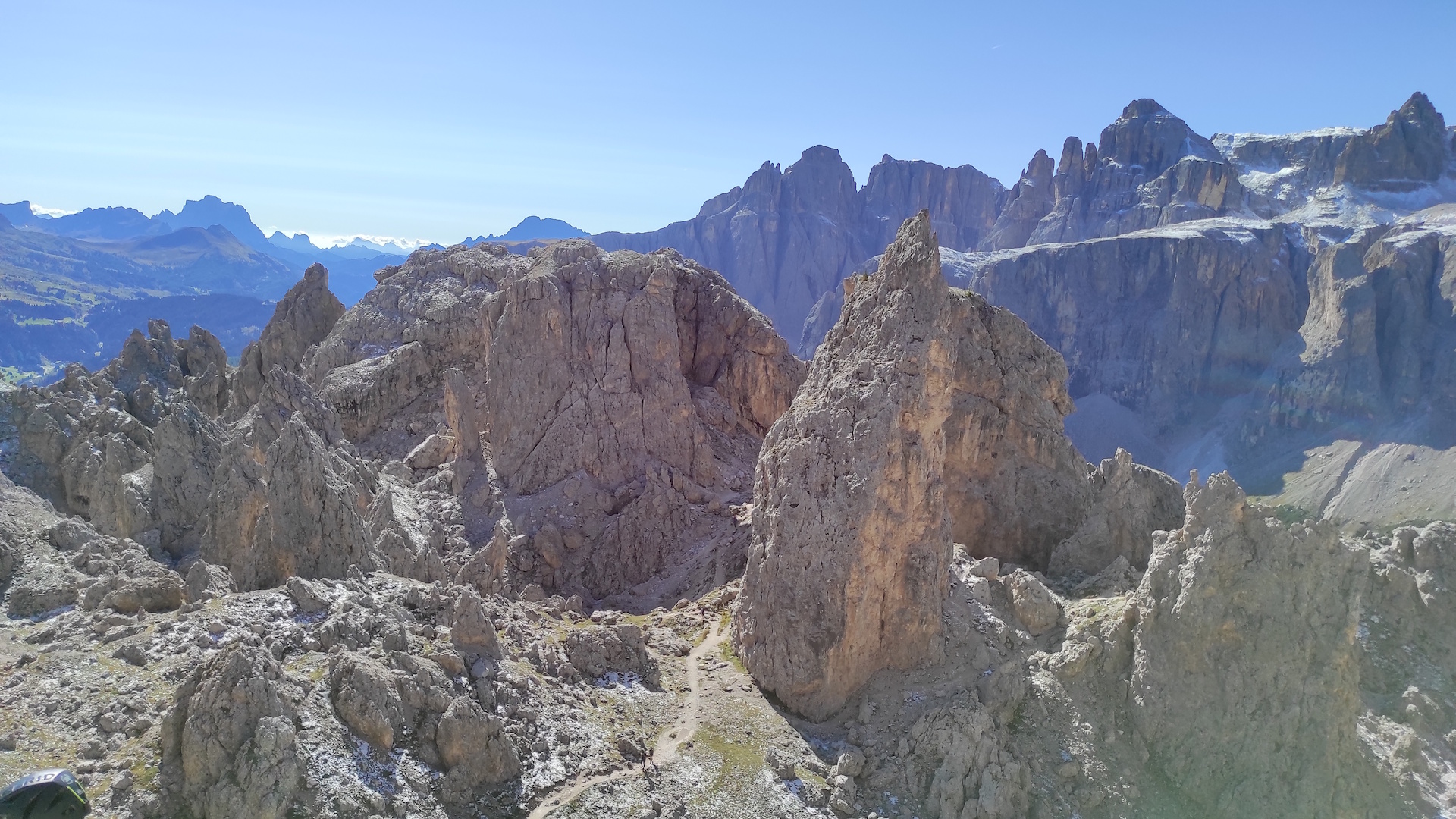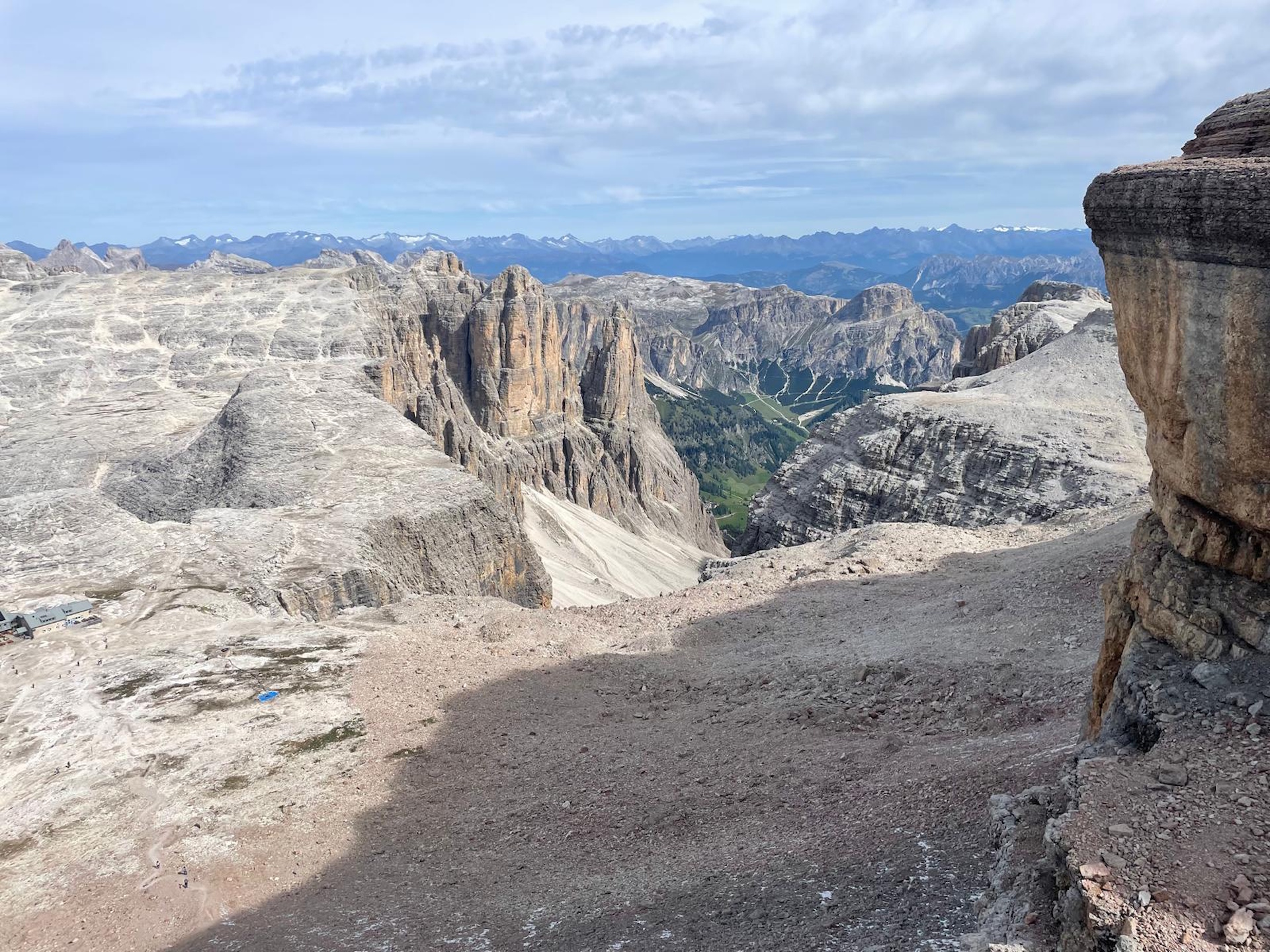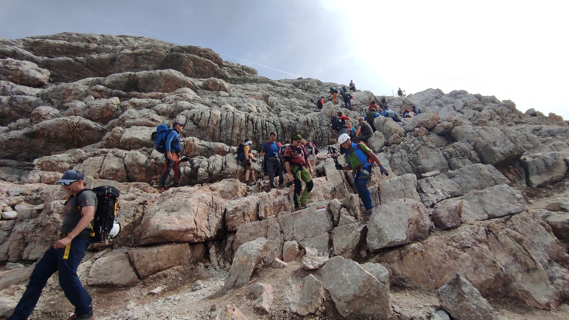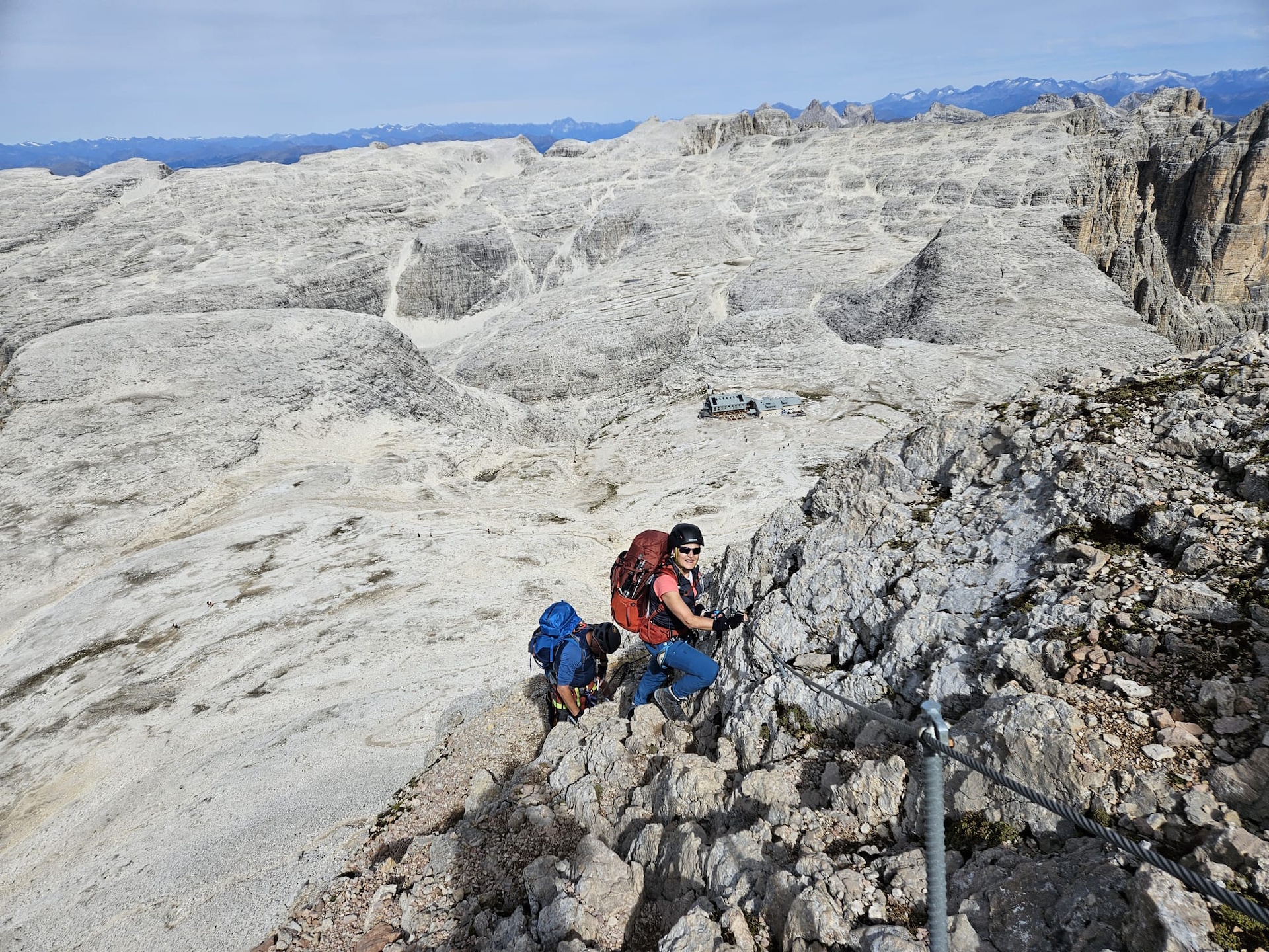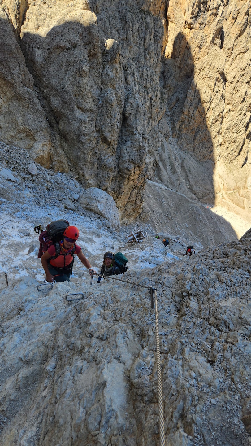 Und täglich grüßt das Frühstück – doch heute leider etwas chaotisch. Das Hüttenpersonal hat so manche organisatorischen Probleme, um es milde auszudrücken😊. Trotzdem können wir zeitig starten. Vielversprechend strahlt die Sonne im wolkenlosen Himmel und wir nehmen Kurs auf den höchsten Punkt der Sella Gruppe und auch unserer gesamten Tour – der Gipfel des Piz Boe mit seinen stolzen 3152 m. Doch bis dahin ist es noch weit. Zunächst steigen wir seilversichert eine Steilstufe hinauf. Zum Glück nicht, wie tags zuvor befürchtet, vereist, sondern relativ trocken und gut griffig. Mittlerweile sind wir ja in so einem Gelände schon geübt und entsprechend gut gelaunt meistern alle diese Hürde. Schließlich stehen wir auf der Hochfläche des Sella Massives in etwa 2900 m. So ähnlich könnte es auf dem Mond auch aussehen. Nach etwa 2,5 Stunden erreichen wir die Bamberger Hütte, auch Boe Hütte genannt. Da waren sie wieder, die zwei Namen. Ein kleiner Teil der Gruppe entscheidet sich dafür, den Gipfel zu umgehen und direkt zur Seilbahn Sass Pordoi zu wandern. Die Gipfelaspiranten steigen in einen leichten Klettersteig ein, der die letzte Steilstufe überwindet, ehe es im Schutt- und Geröll zum höchsten Punkt geht. Ein weiteres, mit Emotionen geladenes, Erlebnis und Highlight dieser Bergtour!!
