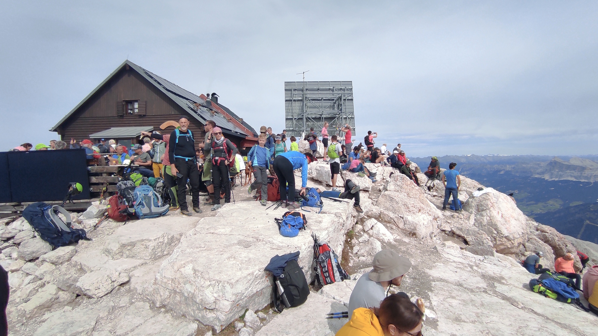 Genau auf dem Gipfel des Piz Boe steht tatsächlich eine bewirtete Hütte, die den Massenansturm, der von der Seilbahn herüberströmt, verköstigt. Das größte Rätsel aber gibt die hässliche Werbetafel auf, die unverkennbar diesen herrlichen Aussichtsberg verschandelt. Uns wird wieder einmal sehr deutlich aufgezeigt, was Seilbahn Massentourismus heißt. Dementsprechend viel „Verkehr“ herrscht auch, beim teils seilversicherten, Abstieg. Einzelheiten beschreibe ich hier lieber nicht😊.