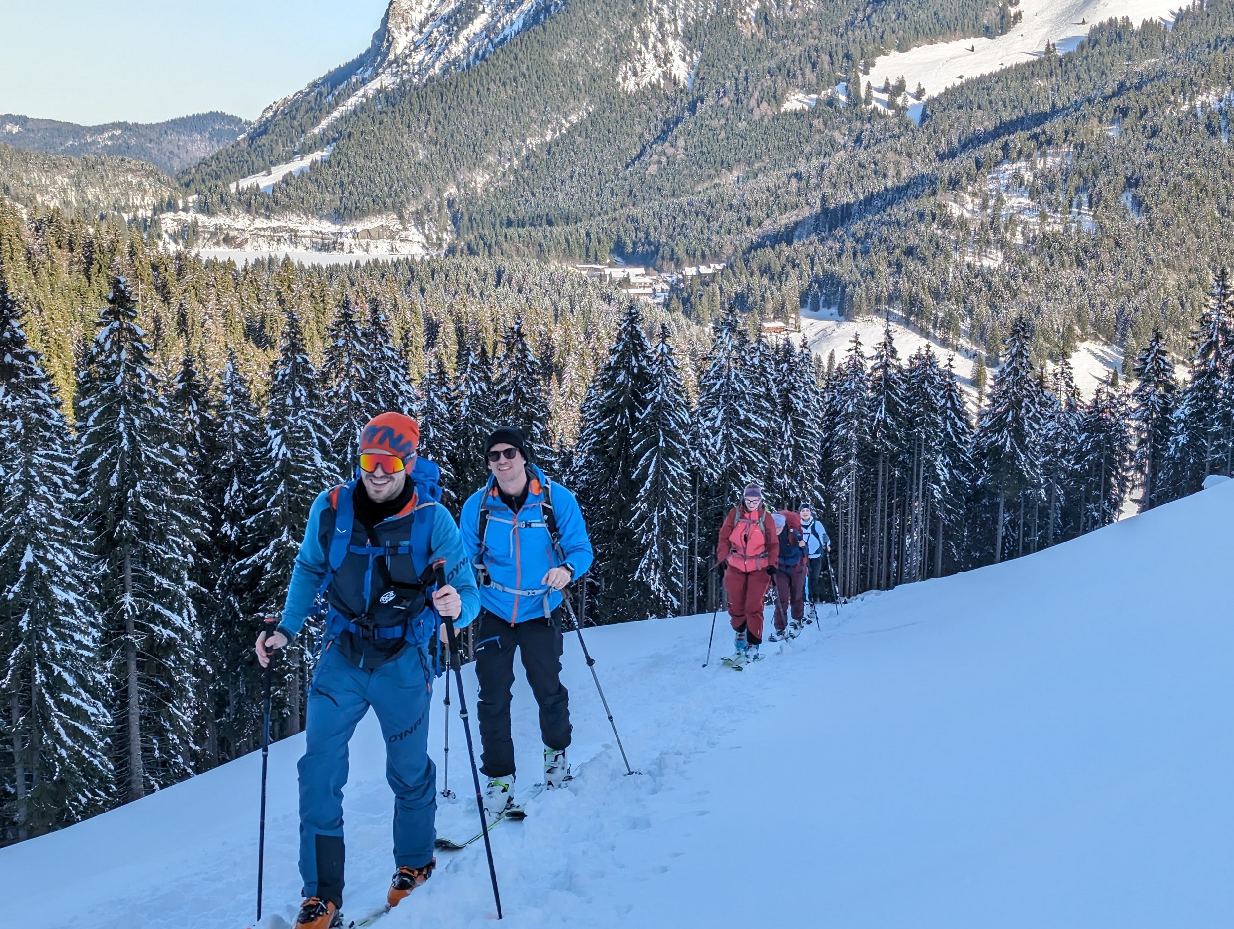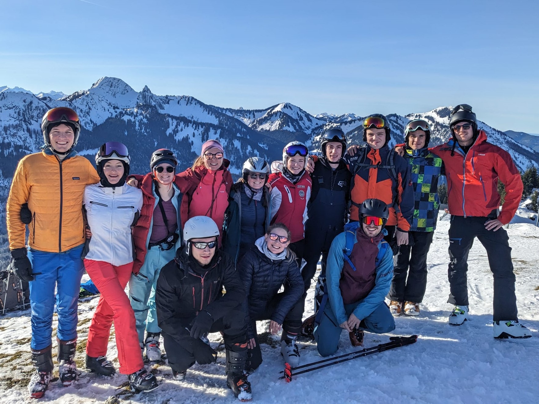 Am letzten Wochenende vor Weihnachten findet traditionell die JDAV-Weihnachtsfeier auf der Weißenburger Hütte statt. Am Freitagabend begrüßte uns die Winterlandschaft der Valepp und stimmte uns auf ein sportliches Wochenende ein. Die super Schneeverhältnisse wurden am Samstag voll ausgenutzt, ein Teil verbrachte den Tag im pünktlich für uns geöffneten Skigebiet Spitzingsee, es wurden Pistenkilometer abgespult und Aperol in der Sonne getrunken. Der Rest machte sich auf den Weg zum Rotwandhaus als kombinierte Schneeschuh- und Skitour. Nach einer ausgiebigen Mittagspause am Rotwandhaus, das sogar geöffnet hatte, machten sich die Schneeschuhgänger*innen auf den direkten Rückweg. Die Skifahren*innen hatten sich die „Rotwand Reibn“ vorgenommen und fuhren zuerst vom Rotwandhaus zur Großtiefentalalm ab und konnten auf dem Weg beste Pulverschwünge genießen. Die beiden Gegenanstiege über den Miesingsattel, das Taubensteinhaus und den Lochgrabensattel zogen sich etwas in die Länge, sodass die letzte Abfahrt über die alte Taubensteinbahnpiste mit Stirnlampen, aber dafür bei bester Sonnenuntergangsstimmung gemeistert wurde. Der für alle sportlich sehr erfolgreiche und anstrengende Tag wurde mit Burgern und einem Lagerfeuer abgerundet. Auch am Sonntag herrschten wieder beste Skiverhältnisse, die ausgiebig genutzt wurden. Ein Teil machte wieder die Pisten unsicher, ein anderer Teil ging mit Tourenski auf den Rosskopf. Auf dem Gipfel brachte die Liftfraktion dankenswerterweise Verpflegung aus dem Auto für die gemeinsame Mittagspause mit. Bei der gemeinsamen Abfahrt über die Rosskopfabfahrt wurde so manche Jacke ein wenig in den Schnee getaucht, aber dafür machte es umso mehr Spaß. Mit der dritten Gruppe, die den Tag am Spitzingsee verbracht hatte, trafen wir uns alle gemeinsam in der Wurzhütte und tranken einen letzten Glühwein auf das schöne Wochenende.