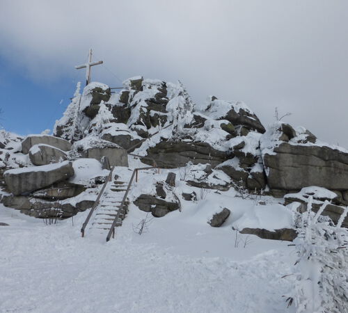Nach einer Stärkung kletterten einige über vereiste Stufen auf den Dreisessel. Dann ging es zur Nepomukkapelle und den Hochstein. Zurück zum Bergasthaus und auf dem Grenzkamm zwischen Bayern und Tschechien wanderten wir Richtung Bayerischen Plöckenstein. Der steife Nordostwind lies einem die Kälte noch stärker empfinden. Da wir uns im Kerngebiet des Nationalparks von Bayern und Tschechien ( Sumava) befanden, herrschte Wegegebot. Am Bay. Plöckenstein genehmigten wir uns im Windschatten eine kleine Rast. Nebenbei bemerkt hatten wir dort oben am Gratrücken in ca.1300m Höhe eine Schneehöhe von 1,80m.