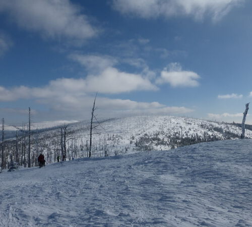 Das Wetter war herrlich, kalt, windig und sonnig. Die Fernsicht hielt sich aber in Grenzen. Die Chiemgauer Alpen konnten wir in dem Dunst leider nicht erkennen. An der Dreiecksmark, ein Grenzstein zwischen Bayern, Österreich und Tschechien wurde nochmals kurz gerastet. Da noch Zeit war wanderten wir noch ein Stück Richtung Österreichischen Plöckenstein. Bevor der Weg aber abbog, kehrten wir um. Der Wind hatte an Stärke zugenommen und die abgestorbenen Bäume, die mit Anraun überzogen waren, schwankten im Wind. Am Anraun konnten wir feststellen woher der Wind in den letzten Wochen mit Schneebeladen herwehte. Wir hielten deswegen einen respekvollen Abstand von diesen „ Schnee-und Eisriesen“. Wir gingen zurück und ab der Dreiecksmark über das „ Steinerne Meer“ und den Wald zurück zum Rosenberger Gut. Bei sehr gutem Essen liesen wir den 1. Tag ausklingen.