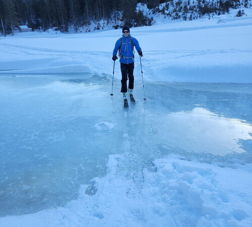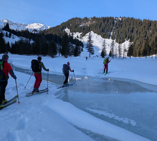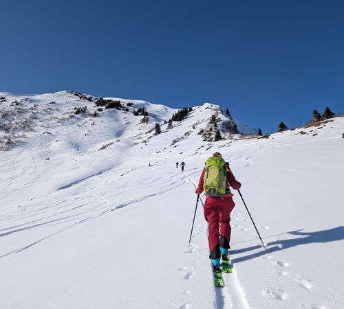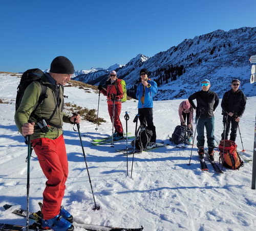 Gleich zu Beginn sorgte jedoch ein falsch eingestellter Ski für eine kurze Verzögerung und die Erkenntnis, dass ein sorgfältiger Materialcheck durchaus seine Berechtigung hat. Nach einer kurzen Schraub- und Zitterphase konnte die Tour schließlich von allen Teilnehmern aufgenommen werden.