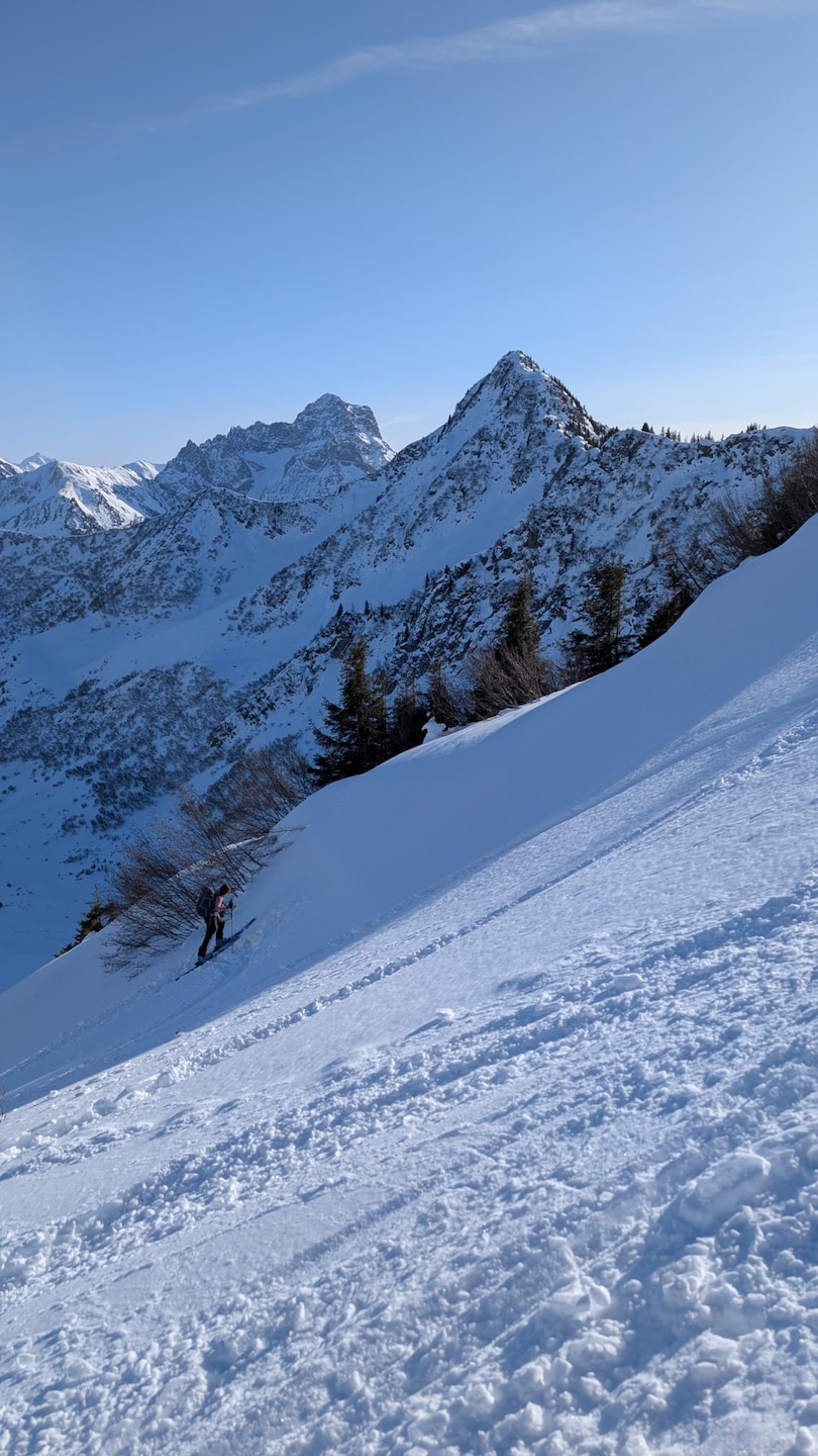 Die Schneeverhältnisse zeigten sich bei der Abfahrt unterschiedlich: Im oberen Bereich war der Schnee harschig und nicht ideal, insgesamt jedoch gut machbar - es hätte auch schlechter sein können. Im unteren Bereich fanden wir angenehmere Bedingungen vor.
