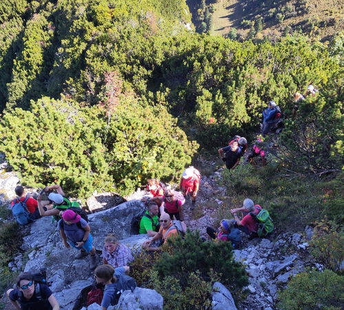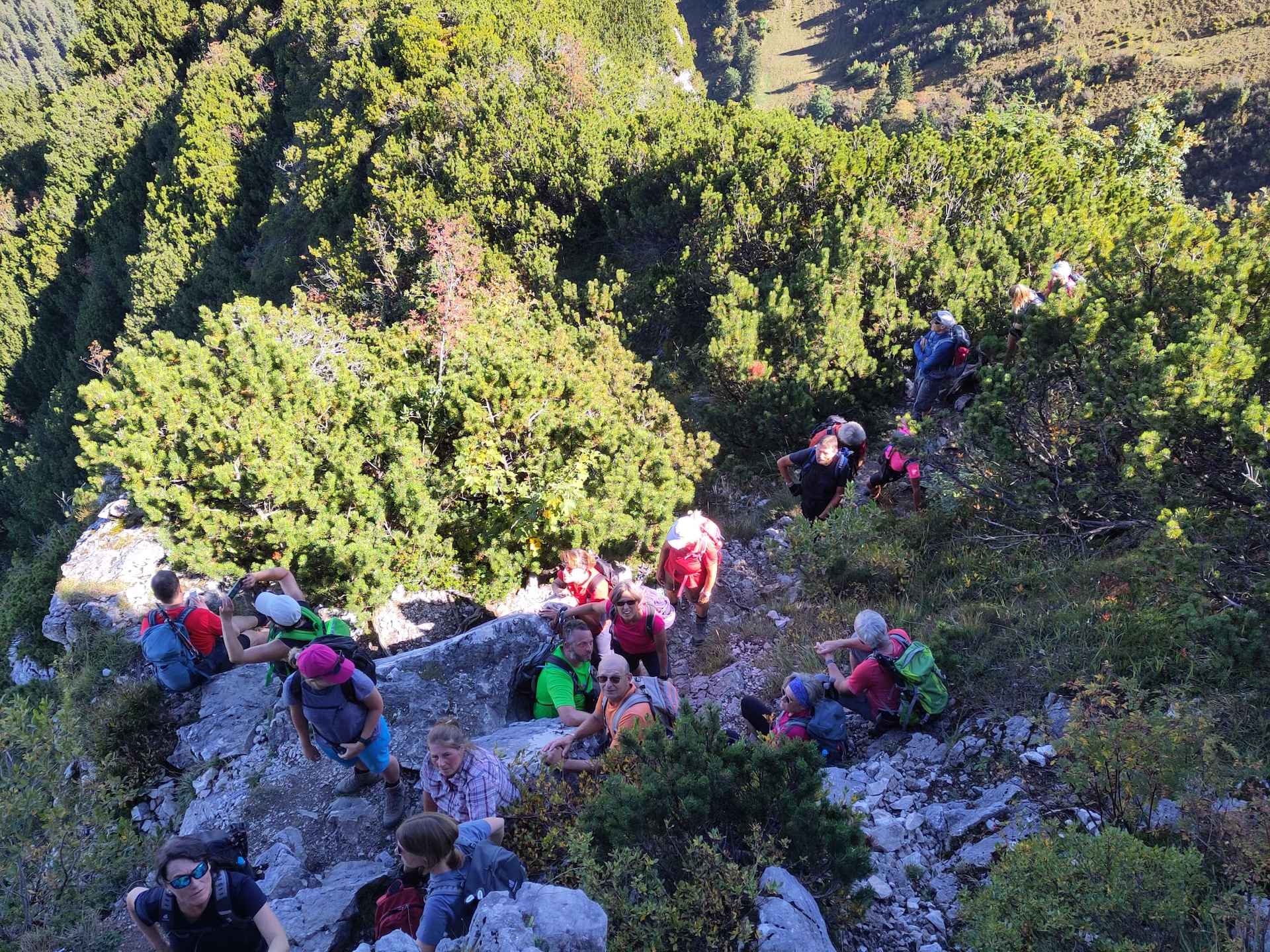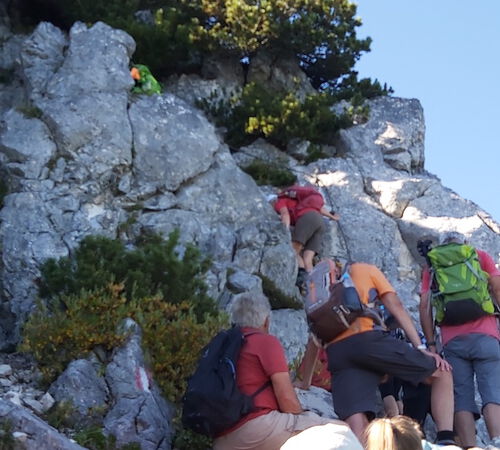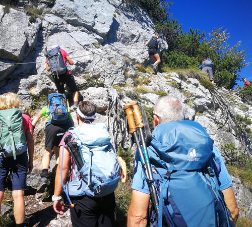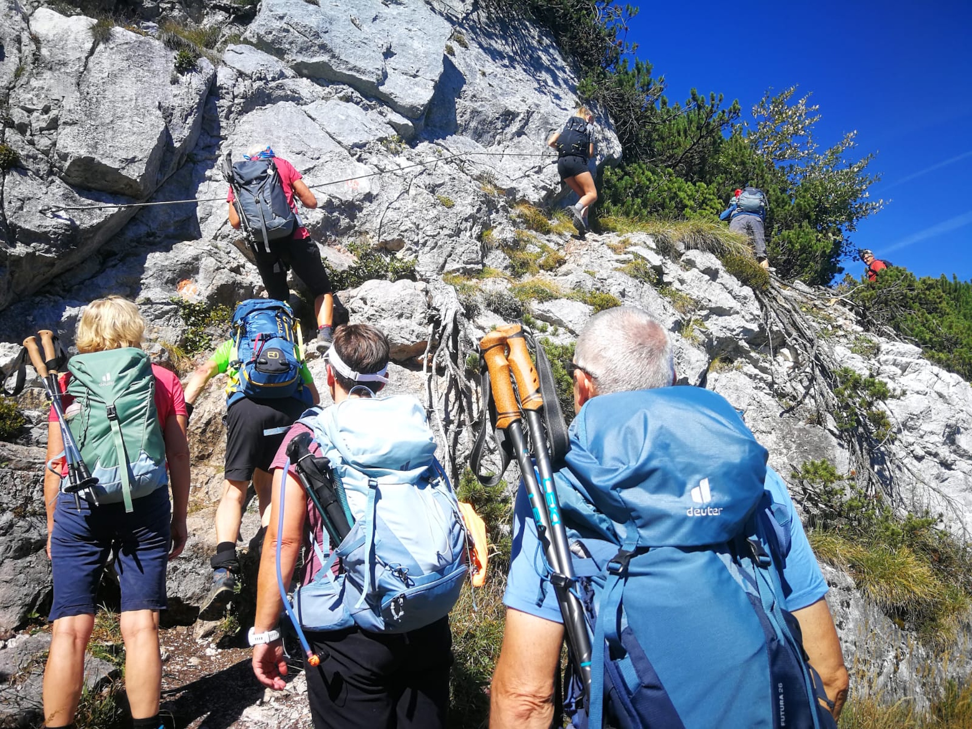Diese letzten 250 HM auf teils sehr ausgesetzten, steilversicherten Weg bei praller Sonneneinwirkung forderten die letzten Reserven, bevor auch sie den grandiosen Rundblick geniesen konnten. Der Abstieg führte auf der selben Route zurück zur Sonnenalm, wo sie mit der Wandergruppe ihre Erlebnisse austauschten und ihren Durst und Hunger stillen konnten.