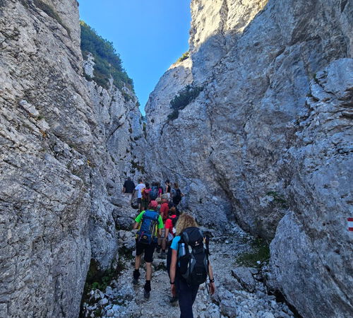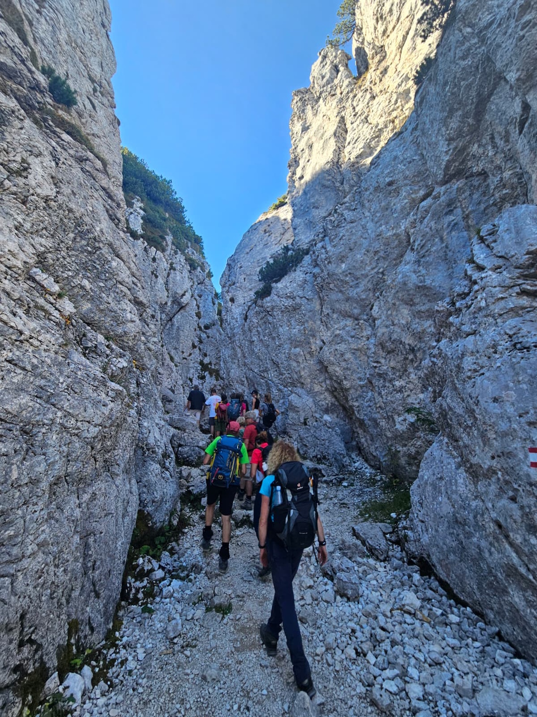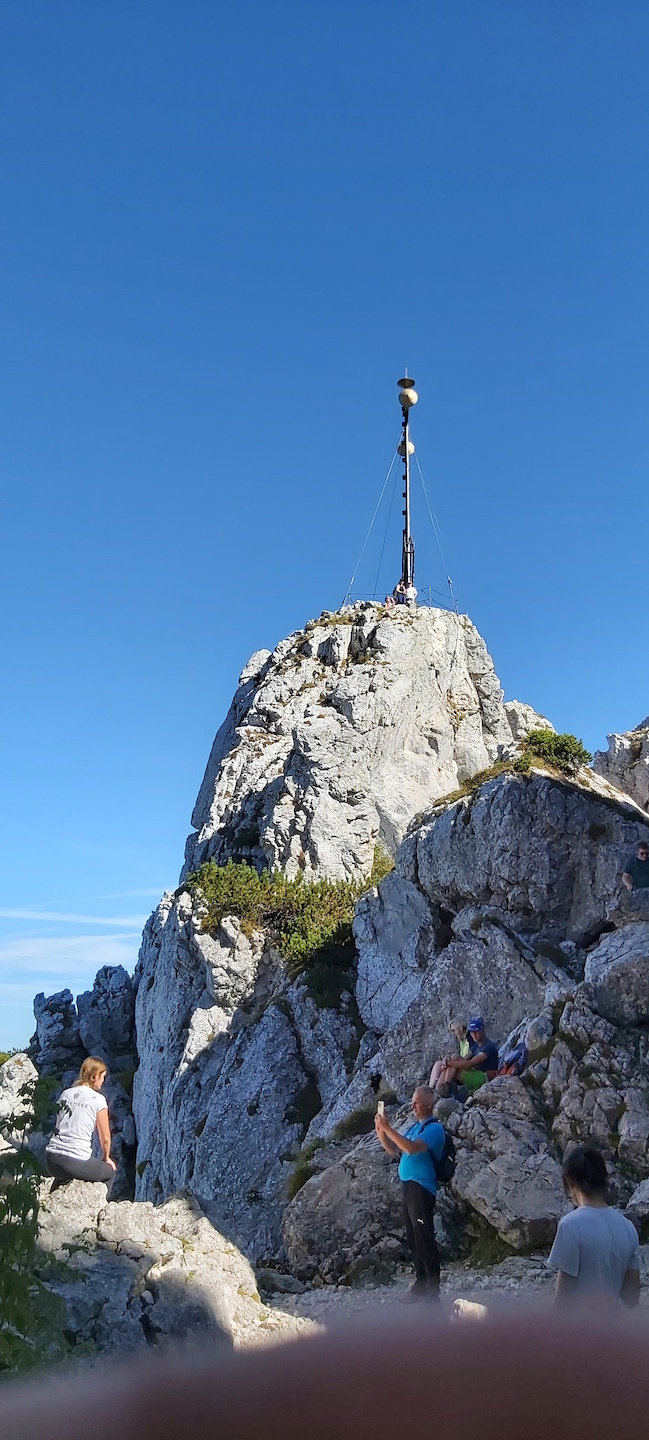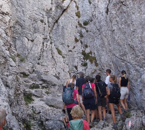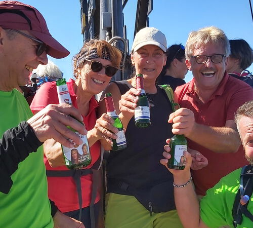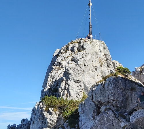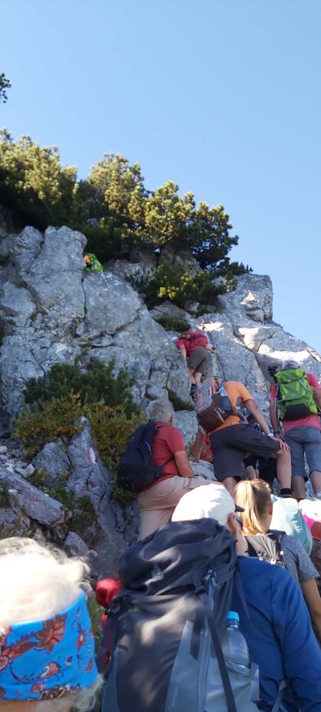 Diese letzten 250 HM auf teils sehr ausgesetzten, steilversicherten Weg bei praller Sonneneinwirkung forderten die letzten Reserven, bevor auch sie den grandiosen Rundblick geniesen konnten. Der Abstieg führte auf der selben Route zurück zur Sonnenalm, wo sie mit der Wandergruppe ihre Erlebnisse austauschten und ihren Durst und Hunger stillen konnten.
