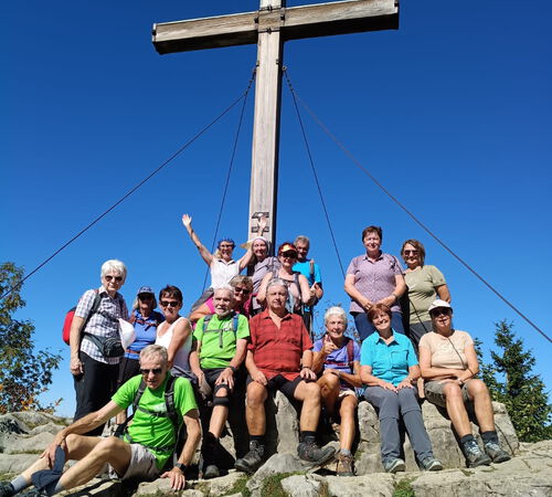 Vom Gipfelkreuz aus bot sich der Wandergruppe ein traumhafter Rundblick, vom Chiemsee bis zu den noch teilweise schneebedeckten Gipfeln, wie Großglockner und Großvenediger. Auch die Loferer Steinberge, das Kaisermassiv und das Karwendel waren in der Ferne erkennen. Da lohnten sich die Handys bei so vielen Bildmotiven. Trotzdem war es an der Zeit, zur Sonnenalm abzusteigen und sich mit den 28 Tourengehern zu treffen. Diese hatten sich im Aufstieg kurz vor der Sonnenalm von der Wandergruppe getrennt und gingen bergauf zur Steinlingsalm. Dort angekommen führte der Weg weiter über den Kampenwandsteig und über die Kampenhöhe zum Ostgipfel. (1.664 HM)