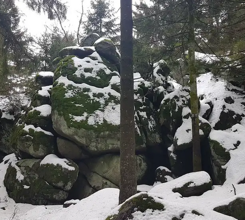 Weiter über Mittagsstein (1.034 m) Richtung Kreuzfelsen. Nach einigen Minuten Wegweiser: Räuber Heigl Höhle (Räuber Heigl, der sogenannte Robin Hood des Bayerischen Waldes 1816-1857; der im Gefängnis von einem Insassen erschlagen wurde). 10 Min. hinab und 15 Min. wieder hinauf.