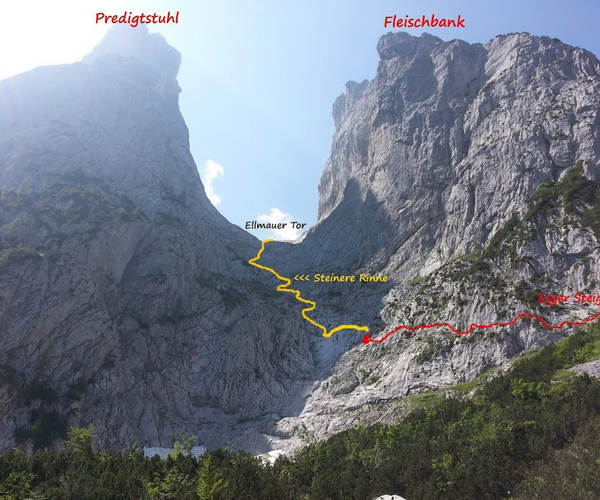 Von der Griesener Alm (977 m) Richtung Stripsenjoch, Abzweig auf den Eggersteig in die „Steinerne Rinne“. Am Ellmauer Tor evtl. Abstecher zur hinteren Goinger Halt (2.192 m). Abstieg über Weg 812 zur Gaunneralm Ellmau.