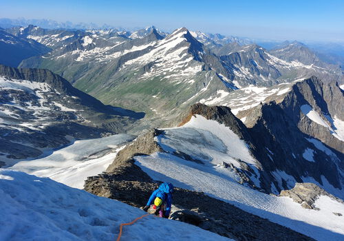 Nach zügigem Abstieg auf dem gleichen Weg, einem kohlenhydratreichen Abendprogramm und einer kurzen Nacht klingelte der nächste Wecker aufgrund der ab Sonntagnachmittag erwarteten kräftigen Gewitter bereits um halb drei. Um zum südseitigen Normalweg zur Dreiherrnspitze zu gelangen, musste nach spärlichem Frühstück zunächst mit etwas Gegenanstieg westseitig der Ahrner Kopf und anschließend unterhalb der Althausschneide zum Althauskees gequert werden. Fortan angeseilt ging es über den anfangs flachen Gletscher und eine bis noch vor wenigen Jahren eisgefüllte, mittlerweile aber bereits früh in der Hochtourensaison vollständig ausapernde Rinne hinauf zur auf italienischem Grund liegenden Gipfelflanke, deren ehemals vollflächige Eisbedeckung wohl ebenfalls in nur mehr wenigen Jahren gänzlich verschwunden sein wird. Der höchste Punkt wurde über den somit großteils felsigen und nur zuoberst steil verfirnten aber mit guter Spur versehenen Südwestgrat erreicht. Die sensationelle Fernsicht reichte vom Triglav bis zur Zugspitze und vom Ortler bis zum Steinernen Meer, beeindruckend dominiert wurde das Panorama jedoch von den sich südlich auftürmenden Dolomiten, die bereits als Ziel für die im September geplante zehnte kontinuierliche Ausgabe der jährlichen Jugend-Sommerfahrt auserkoren wurden. Der Abstieg erfolgte zeitsparend über eine steile und unübersichtliche, höchstens noch sehr früh im Jahr empfehlenswerte Direktroute zur immer weniger langen Zunge des Umbalkees und nach einer kurzen Pause an der Clarahütte weiter dem Verlauf der Isel folgend zurück zum Parkplatz, um dort erschöpft die mit Erreichen der A8 von Starkregen und Gewitter begleitete Heimreise anzutreten und schließlich um eindrückliche Bergfahrten bereichert von den sehnsüchtig erwarteten heimischen Betten verschlungen zu werden.