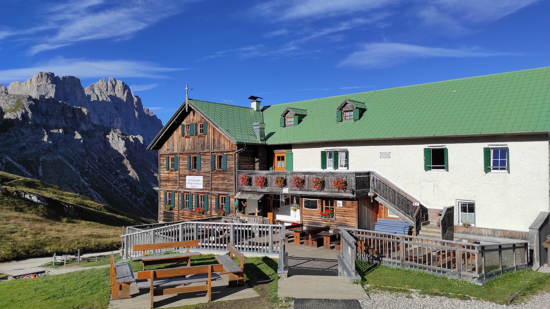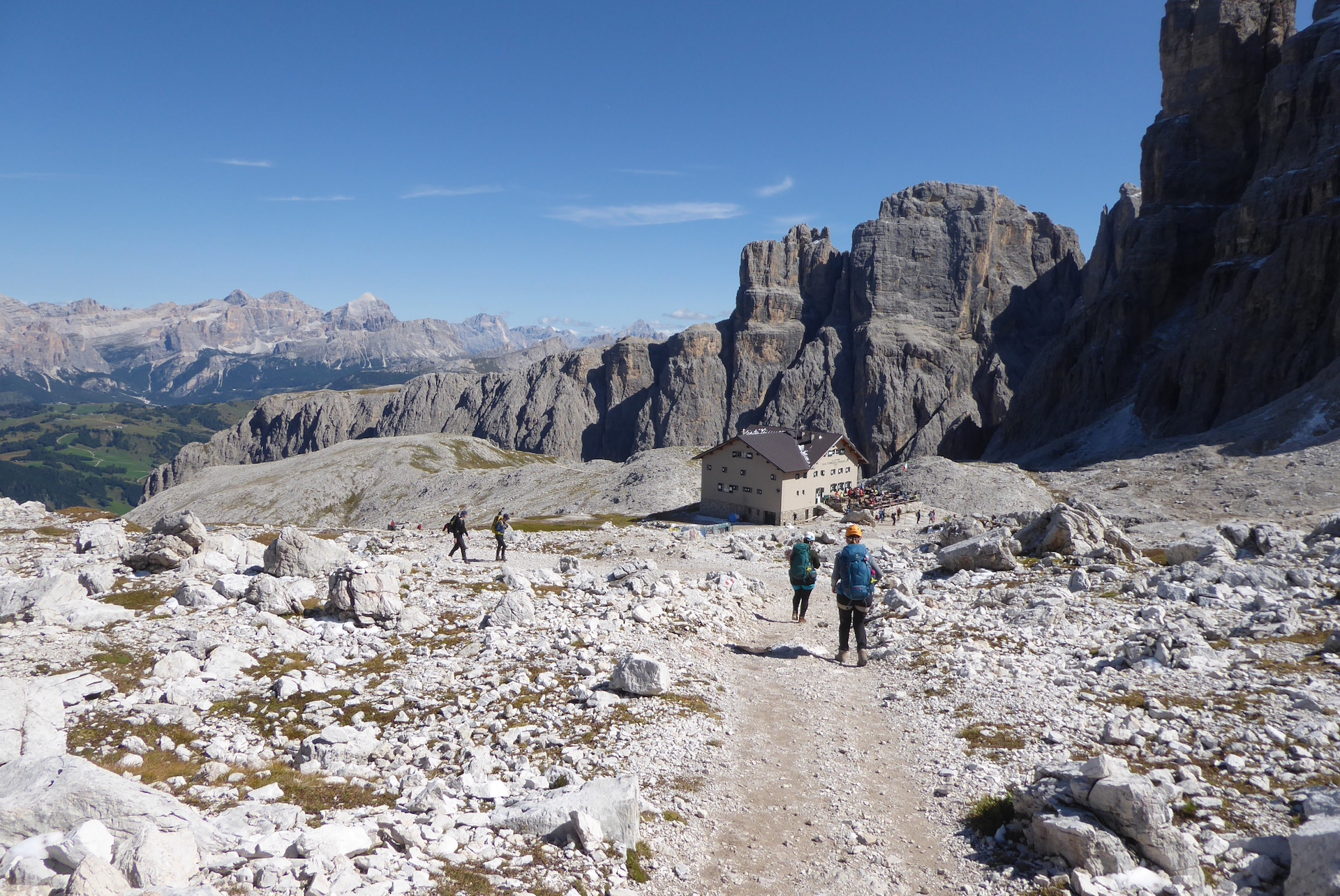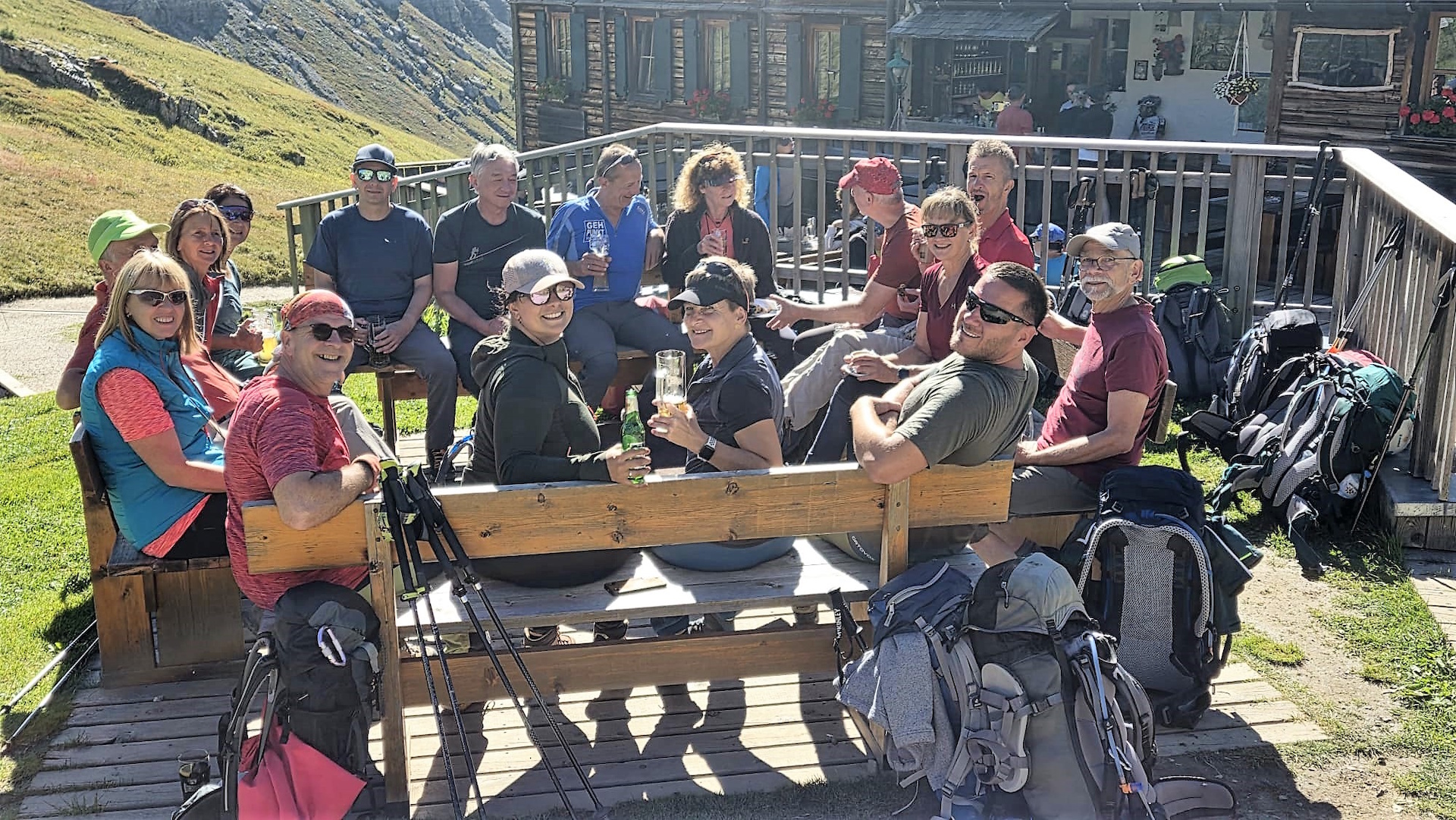 10 Minuten später sitzen wir auf der herrlichen Terrasse der „Pisciadu Hütte“ auf 2587 m und lassen es uns richtig gut gehen. Die Nachmittagssonne wärmt wohltuend die müden Knochen und manch einer lässt sich eine Abkühlung im nahe gelegenen See nicht entgehen. Zu allem Glück endet der sowieso schon fast perfekte Tag noch mit Gitarrenmusik und vielen bekannten Liedern in der Gaststube – es gibt also doch ein „fast perfekt“!!