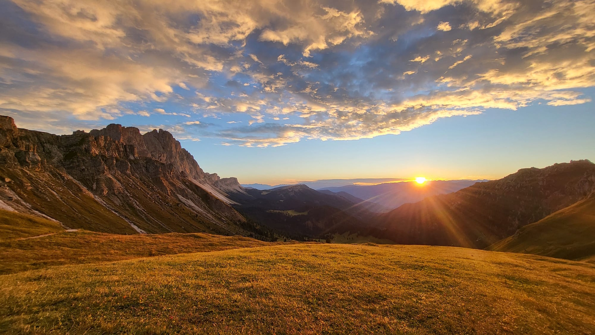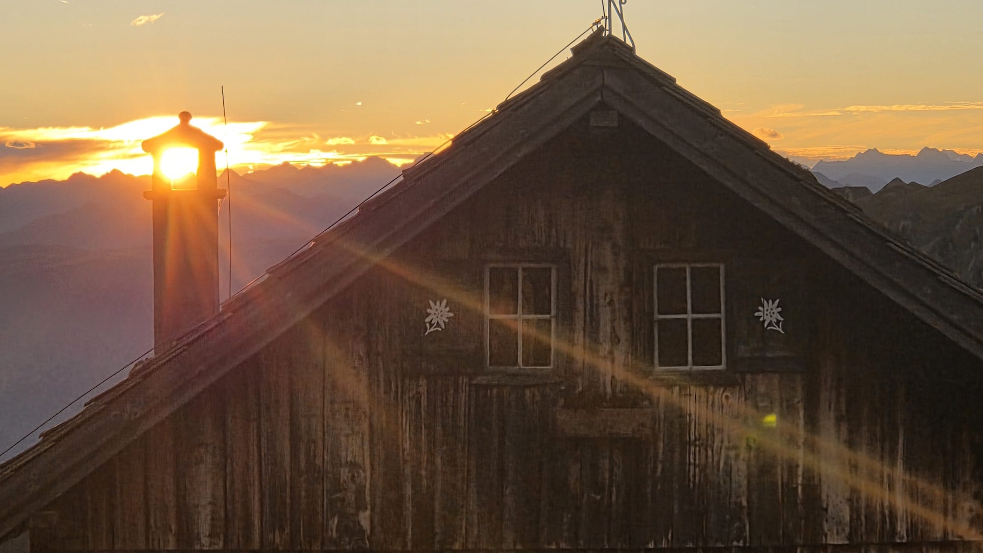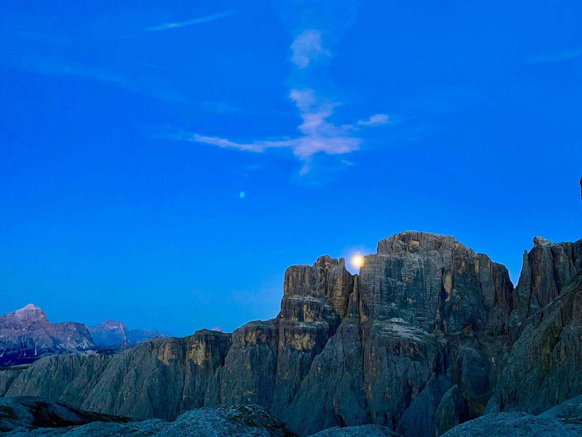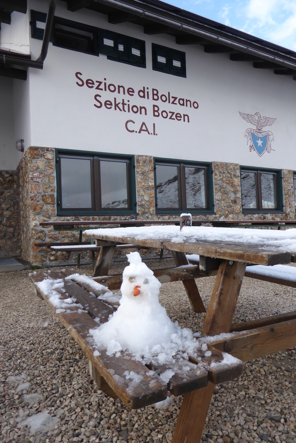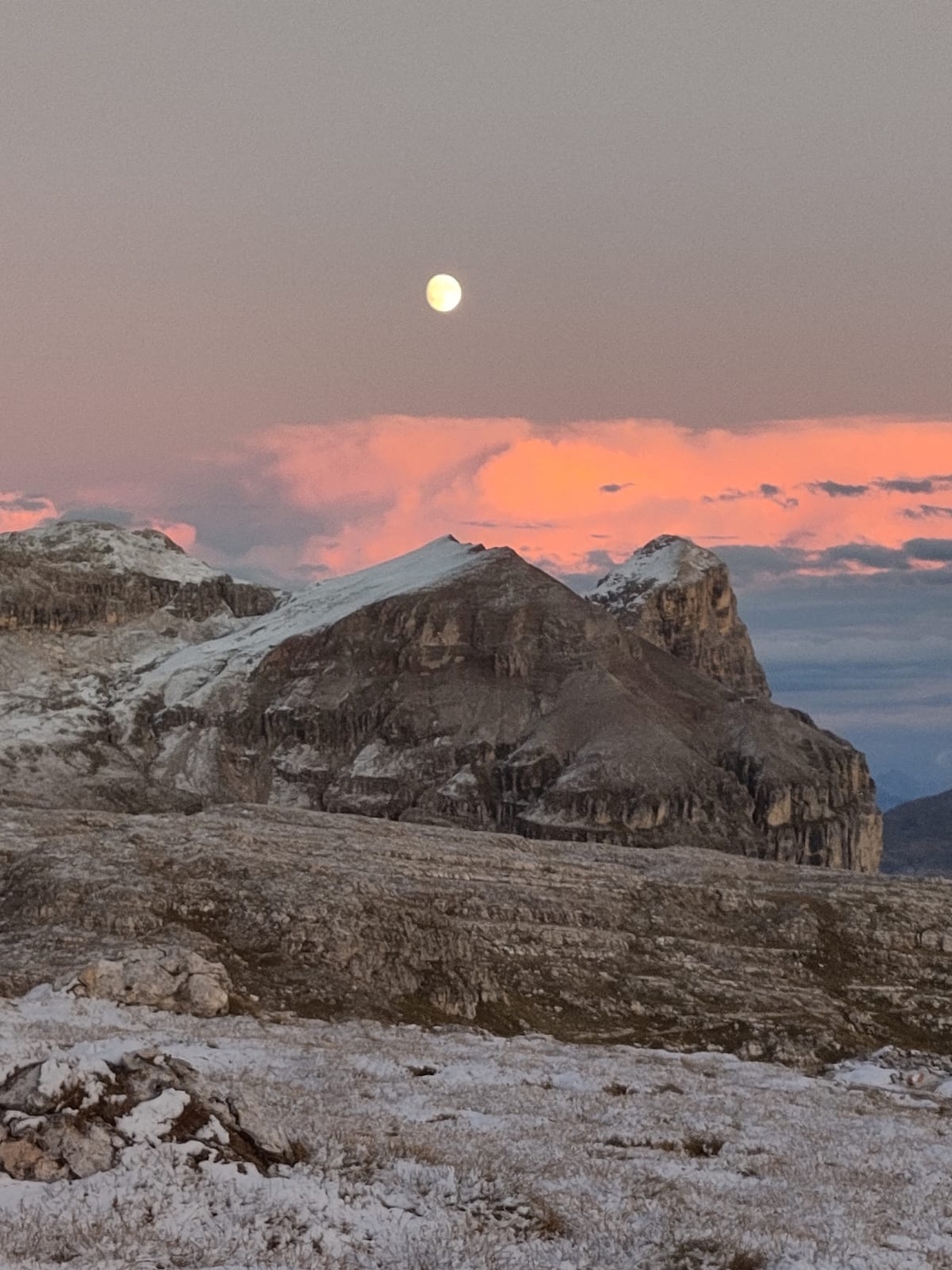 Tatsächlich sind wir keine Sekunde zu früh zurück. Bereits nach kurzem Regenschauer rasen die Wolken mit einer irren Geschwindigkeit um die Hütte. Heftiger Wind zieht auf und es kühlt sehr stark ab. Keine zwei Stunden später erfreut sich die Tochter der Wirtsleute an bestem Schnee und baut vergnügt einen Schneemann auf den Gartenbänken. 3 – 4 cm hat’s geschneit. Die Kaltfront ist durchgezogen. Am Abend reißt die Wolkendecke wieder auf. Sonne und Mond stehen jetzt zeitgleich am Abendhimmel, als wollten sie sich gute Nacht sagen. Ein Wetter- und Naturschauspiel, das fast schon etwas kitschig wirkt. Gegenüber strahlt der Sellastock mit dem Piz Boe im winterlichen Kleid herüber, unten im Tal ist alles grün. Bei derartigen Verhältnissen und Bedingungen verspricht der kommende Tag ein besonderer zu werden.