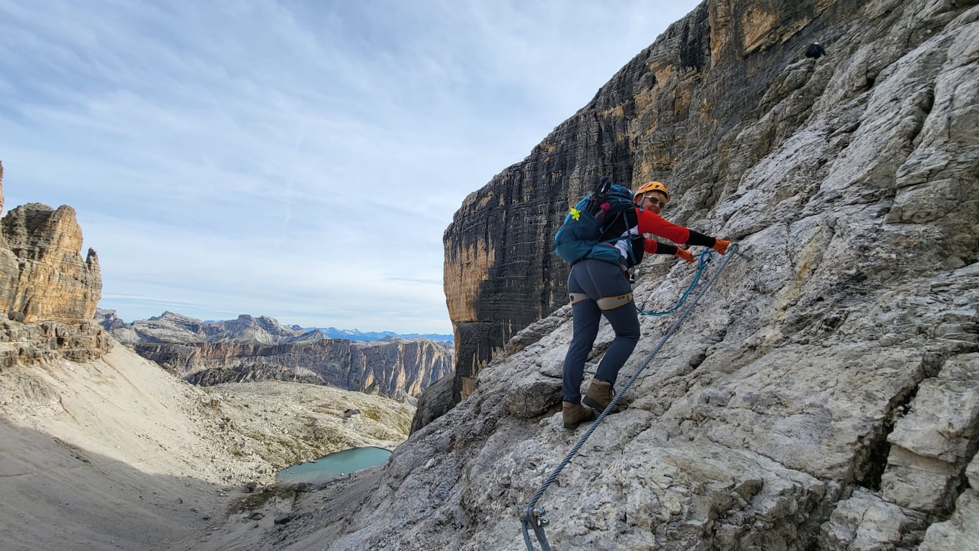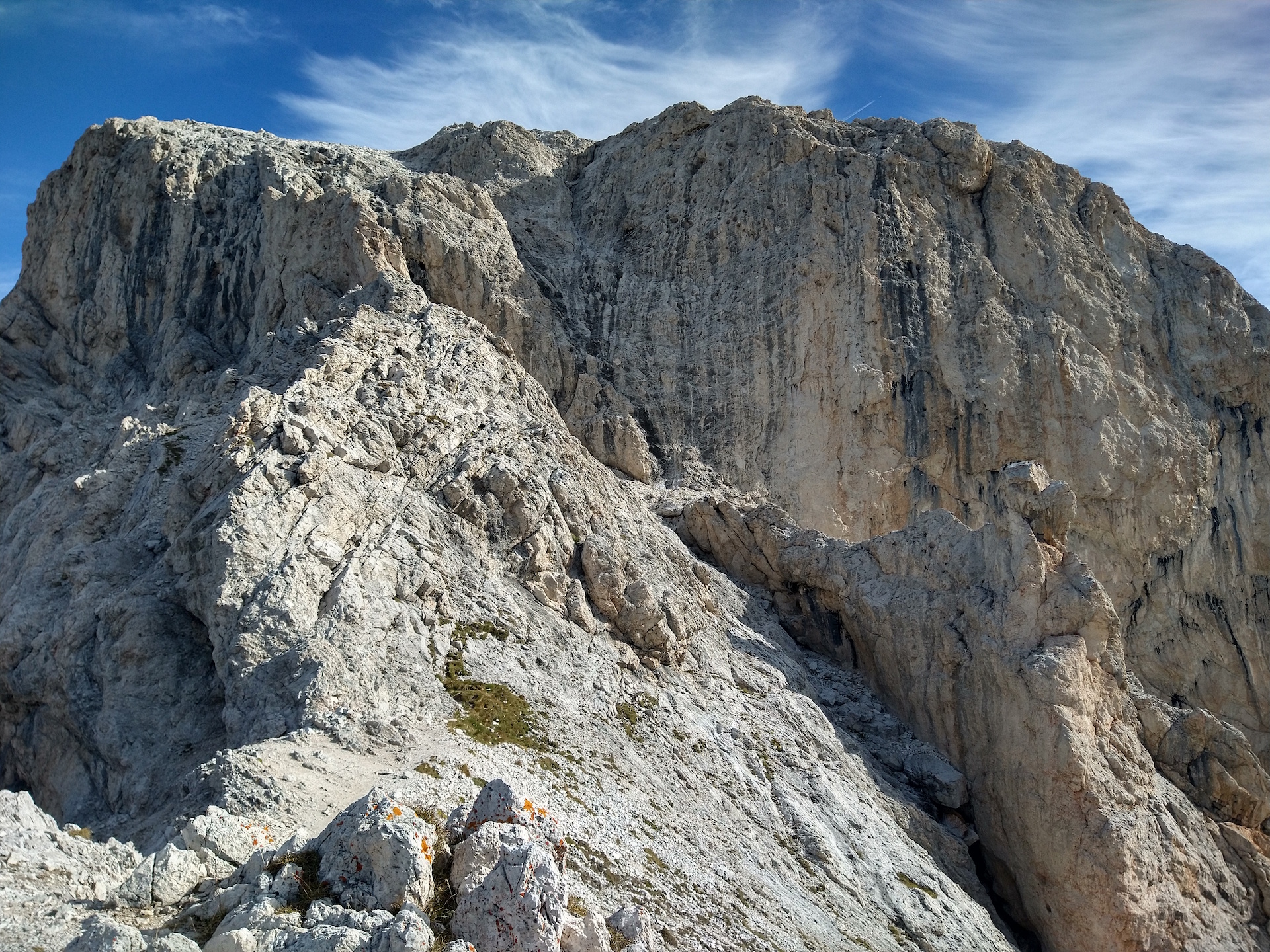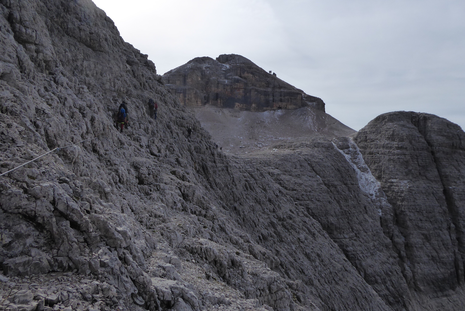 Und täglich grüßt das Frühstück – doch heute leider etwas chaotisch. Das Hüttenpersonal hat so manche organisatorischen Probleme, um es milde auszudrücken😊. Trotzdem können wir zeitig starten. Vielversprechend strahlt die Sonne im wolkenlosen Himmel und wir nehmen Kurs auf den höchsten Punkt der Sella Gruppe und auch unserer gesamten Tour – der Gipfel des Piz Boe mit seinen stolzen 3152 m. Doch bis dahin ist es noch weit. Zunächst steigen wir seilversichert eine Steilstufe hinauf. Zum Glück nicht, wie tags zuvor befürchtet, vereist, sondern relativ trocken und gut griffig. Mittlerweile sind wir ja in so einem Gelände schon geübt und entsprechend gut gelaunt meistern alle diese Hürde. Schließlich stehen wir auf der Hochfläche des Sella Massives in etwa 2900 m. So ähnlich könnte es auf dem Mond auch aussehen. Nach etwa 2,5 Stunden erreichen wir die Bamberger Hütte, auch Boe Hütte genannt. Da waren sie wieder, die zwei Namen. Ein kleiner Teil der Gruppe entscheidet sich dafür, den Gipfel zu umgehen und direkt zur Seilbahn Sass Pordoi zu wandern. Die Gipfelaspiranten steigen in einen leichten Klettersteig ein, der die letzte Steilstufe überwindet, ehe es im Schutt- und Geröll zum höchsten Punkt geht. Ein weiteres, mit Emotionen geladenes, Erlebnis und Highlight dieser Bergtour!!