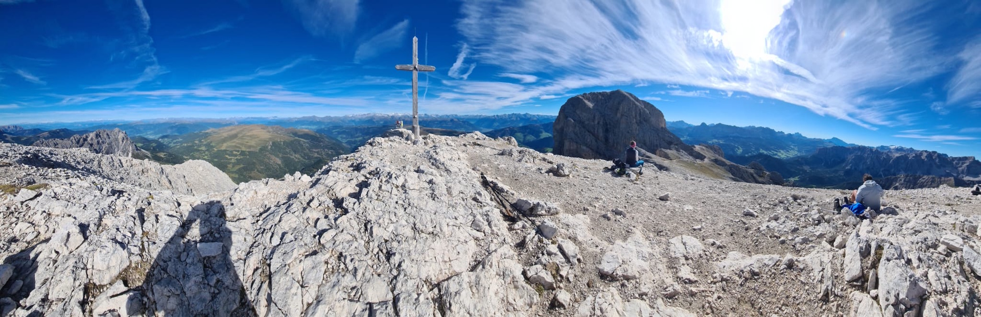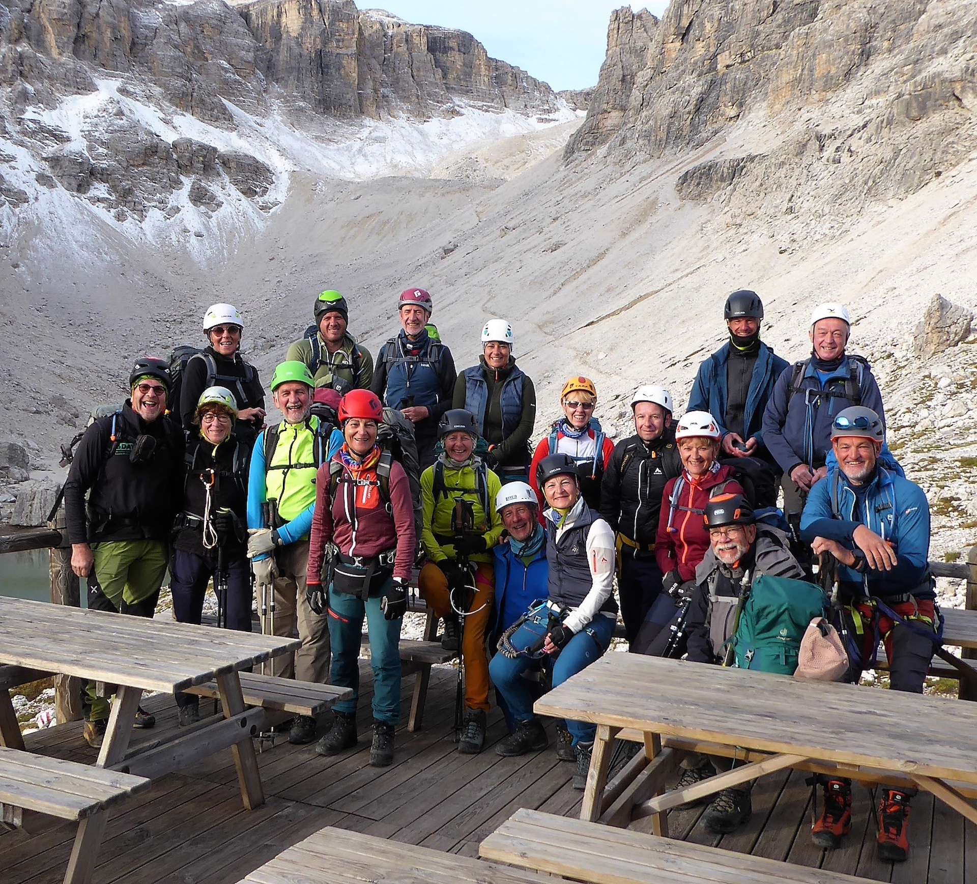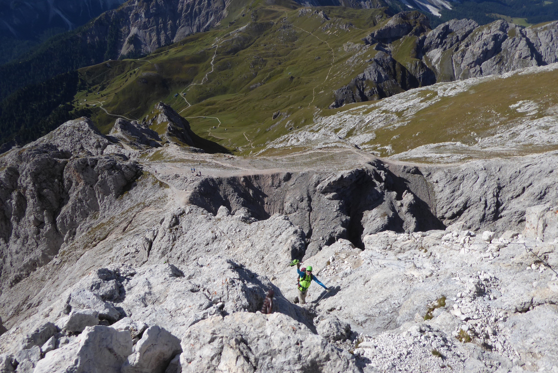 Frühstück 07:00 Uhr – Abmarsch spätestens 08:00 Uhr - das ist die Ansage für die Gipfelaspiranten. Schließlich steht heute ein Besuch bei „seiner Majestät“ dem Peitlerkofel auf dem Programm. Und da wollen wir doch einen guten Eindruck hinterlassen!! Bis zur Scharte ist uns der Zustieg bereits bekannt – sollte man zumindest glauben! Mit kleinem Umweg finden wir diese dann auch. Ab hier wird es deutlich steiler und etwas anspruchsvoller. Auf einem gut ausgebauten Felssteig arbeiten wir uns schwitzend in die Höhe. Von der Scharte zum Gipfel sind es doch nochmals über 500 Hm. Am Punkt 2750 m muss sich jeder Einzelne nun entscheiden, ob er den leichten Klettersteig zum Hauptgipfel auf 2875 m oder den einfacheren Wanderweg zum „Picia Putia“, dem „kleinen Peitlerkofel“ auf 2813 m gehen will. Egal – das 360° Panorama ist von beiden Plätzen so traumhaft schön, dass man es mit keinen Worten beschreiben kann. Wir sehen einfach alles, was in den Ostalpen Rang und Namen hat. Einigen von uns fehlen die Worte, andere nehmen den Helm ab und verneigen sich vor diesem Paradegipfel! Ein wahrhaftig unvergesslicher Moment in jedem Bergsteigerherz.