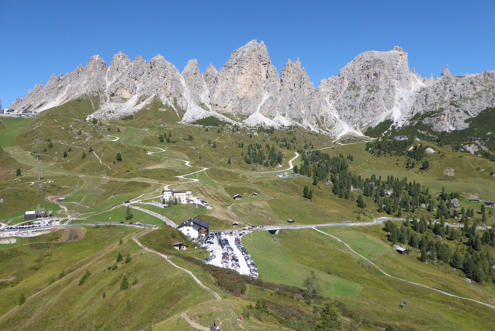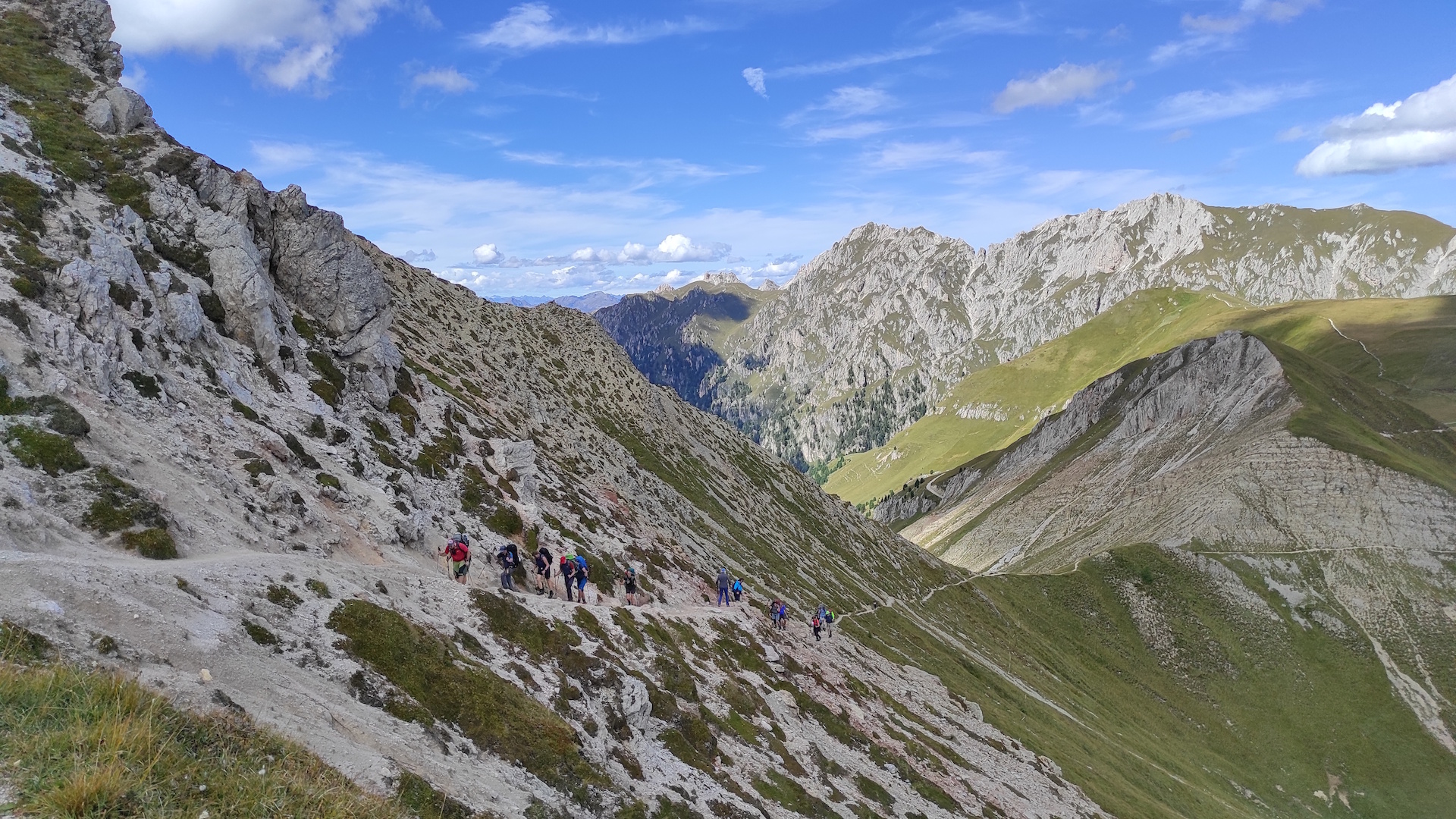 Aufgrund der Brenner Baustelle und der Tatsache, dass noch Ferien sind, startet unsere 18-köpfige Bergsteigergruppe bereits um 03:00 Uhr am Seeweiher Parkplatz. Mit zwei Kleinbussen fahren wir nach Südtirol zum Pordoi Pass am Fuße des Sellastockes. Hier ist auch unser Zielpunkt der fünftägigen Hüttentour durch die Puez-, Geisler- und Sellagruppe. Drei Shuttle Busse chauffieren uns in weiteren 1,5 Stunden zum Ausgangspunkt am Würzjoch.