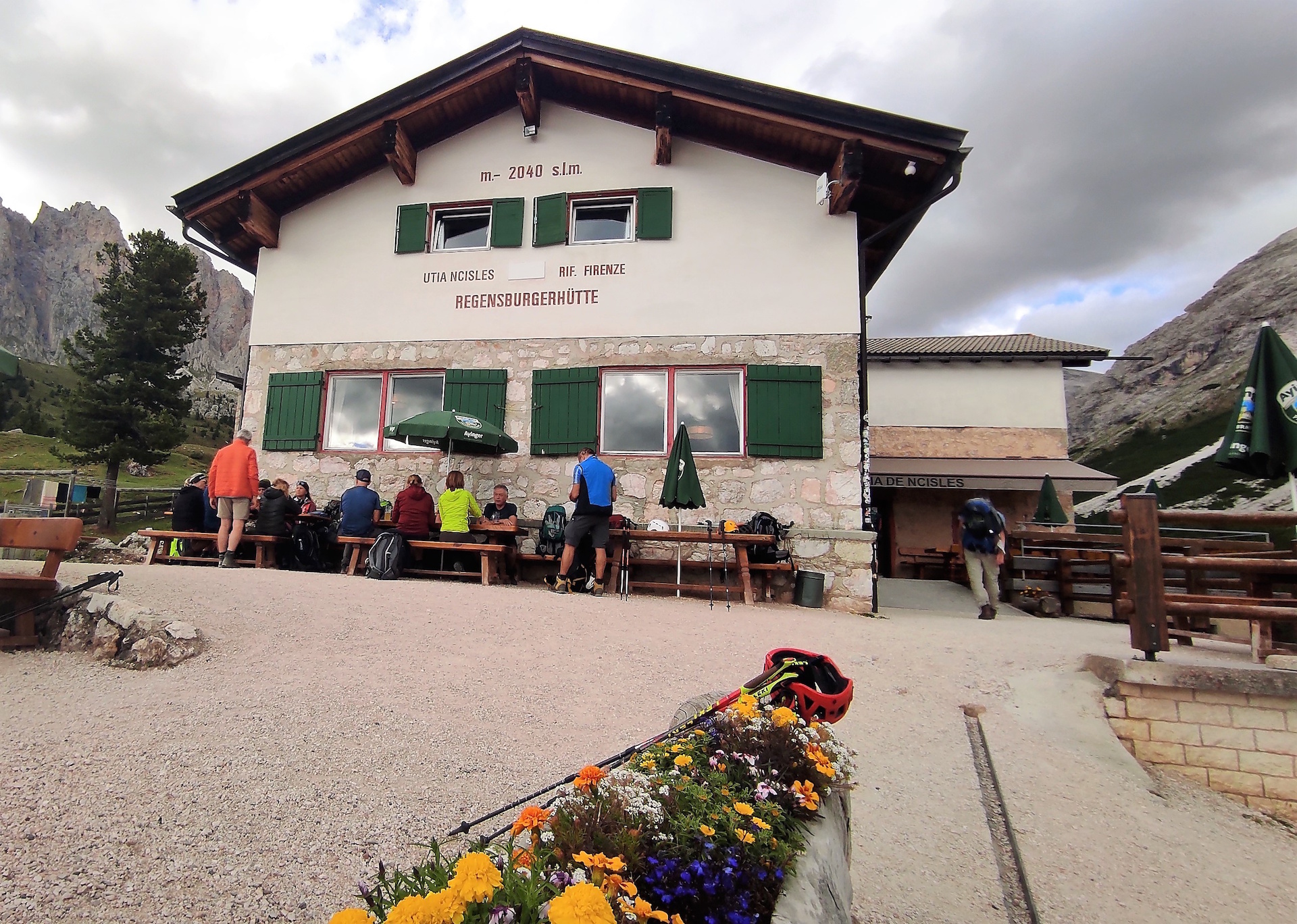 Mit diesem beeindruckenden Erlebnis kehren wir kurz vor Mittag zur Schlüterhütte zurück, um unser schweres Gepäck abzuholen. Nach einer kurzen Stärkung setzen wir unsere Tour durch die Puez – Geislergruppe fort. Unser Tagesziel, die Regensburger Hütte, liegt noch etwa 4,5 Stunden entfernt. Auf dem Weg dorthin müssen wir die sog. „Roa Scharte“ überqueren – und die ist richtig steil! Bis wir allerdings so weit sind, führt der Steig in leichtem Auf und Ab durch eine absolut bezaubernde Gebirgswelt. Ob nah oder fern – das Panorama raubt uns allen immer wieder den Atem. Man vergisst fast jegliche Anstrengung und könnte eigentlich alle fünf Meter stehen bleiben und fotografieren. Doch dann erreichen wir sie halt doch, die Steilstufe zur Scharte. In bekanntem Dolomiten Gebrösel schraubt sich der Pfad teilweise über 35° steil nach oben. Links und rechts stehen teils mehrere hundert Meter hohe Felswände. Wie war das nochmal mit dem Permafrost?? Bitte nicht jetzt!! Zwei- bis dreimal müssen wir auch einem Steinschlag ausweichen und drücken uns ganz nah an den Hang, so gut es halt geht. Glück gehabt! Oben angekommen, werden wir mit dem nächsten „WOW“ Erlebnis belohnt. Der Ausblick entschädigt für die Strapazen und Gefahren der letzten Stunden. Leider bläst aber auch ein sehr unangenehmer Wind. Also nix wie weg hier. Zur Hütte sind es noch eineinhalb Stunden, wobei uns der faszinierende Anblick der Geislerspitzen jegliche Mühen vergessen lässt. Es fällt gar nicht so leicht ständig auf den Weg zu schauen, ist aber unbedingt erforderlich! Völlig überwältigt von den unzähligen Eindrücken des heutigen Tages erreichen wir die Regensburger Hütte. Auch hier fühlen wir uns sofort wohl und werden bestens bewirtet. Auffällig sind die Doppelnamen der Unterkünfte. Die „Schlüterhütte“ heißt auch „Rif. Genova“ und die Regensburger trägt den Zweitnamen „Rif. Firenze“. Die nette Wirtin erklärt uns, dass das noch vom Dolomitenkrieg stammt, als Südtirol noch österreichisch war. Man hat die alten Namen aus historischen Gründen beibehalten. Also haben wir heute auch kulturell etwas dazu gelernt. Mit einem herrlichen Panorama zum gegenüberliegenden Langkofel und Rosengarten klingt der zweite Abend gemütlich aus.