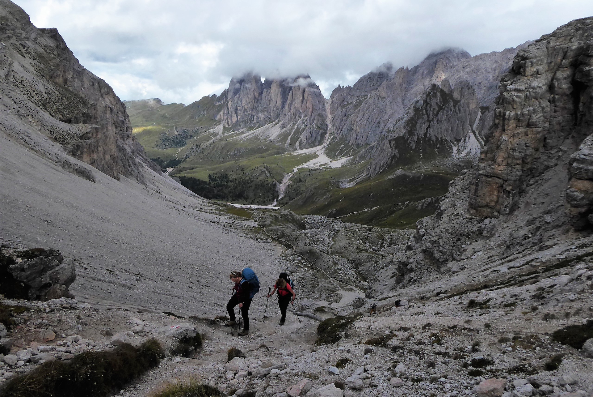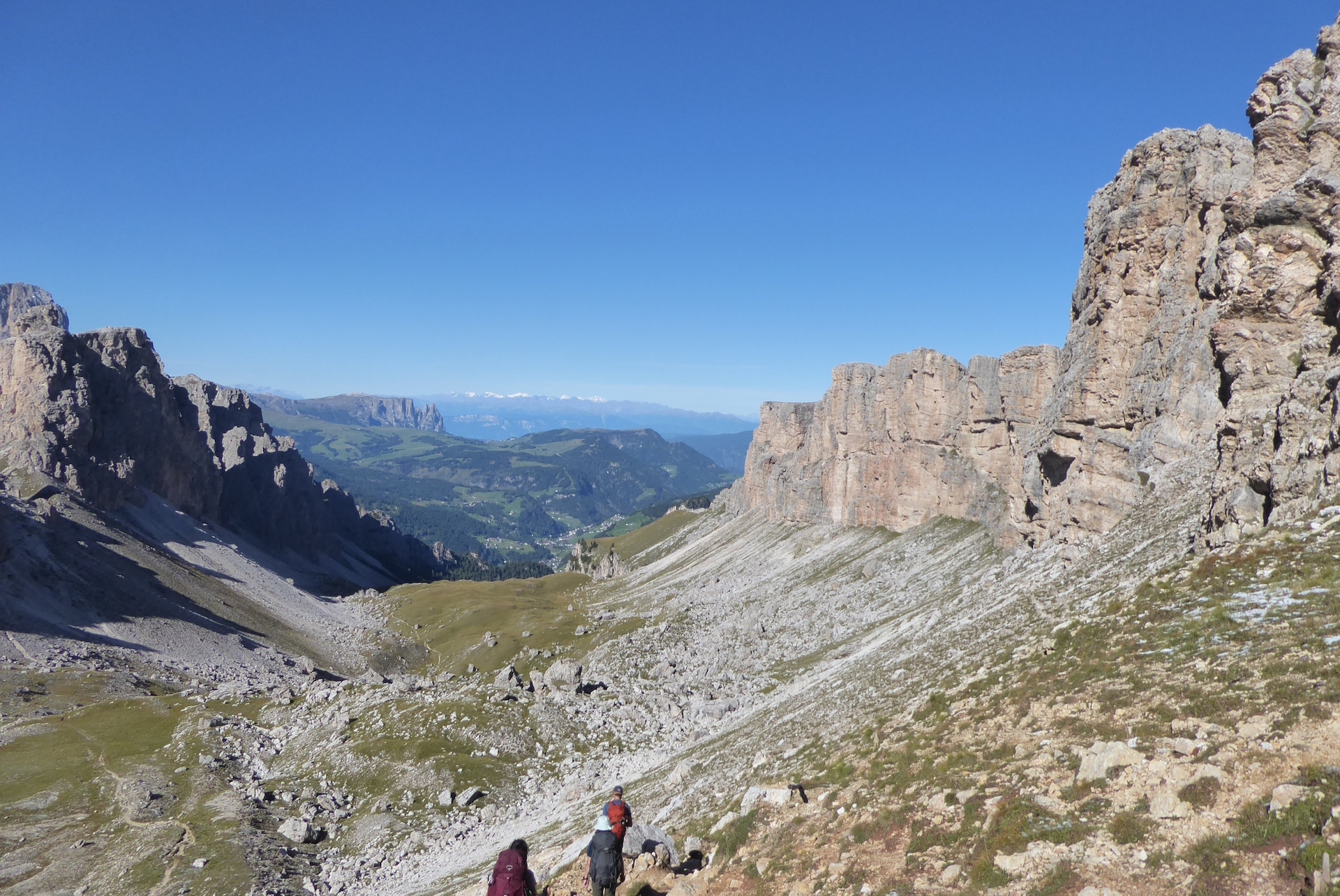 Der morgendliche Blick aus dem Fenster ist zweifelhaft. Einerseits herrscht eine unbeschreibliche Sonnenaufgangs- und Wolkenstimmung, andererseits verheißen die Nebelschwaden nichts Gutes. Beim Frühstück entscheiden wir uns, aufgrund der heutigen Wetterprognosen, für eine kürzere Variante zum nächsten Tagesziel, der Puezhütte. Auf dem Dolomiten Höhenweg 2 wandern wir über steiles, felsiges Terrain. Einige Steilstufen sind seilversichert. In diesem Gelände zwischen 2600 m – 2800 m kann ein plötzlich einsetzender Regenschauer fatale Folgen haben. Deshalb wählen wir den direkten Weg zum Schutzhaus. Unterwegs auf der Hochfläche der Puezalm öffnet sich der fantastische Blick hinunter ins „Langental“ bis nach Wolkenstein und St. Christina im Grödnertal. Bei manchen Panoramen zweifelt man an der Echtheit, so malerisch schön sind sie. Bereits um die Mittagszeit erreichen wir unser Ziel. Da das Wetter anscheinend doch noch etwas länger aushält, erkunden wir, nach einer ausgiebigen Kaffeepause, die nähere Umgebung der Hütte, immer bereit für einen raschen Rückzug, im Falle eines Unwetters. Diesen Rat gibt uns der Bergführer und Hüttenchef mit auf den Weg. „Die Gipfel lasst ihr heute Nachmittag lieber sein!“ warnt er pflichtbewusst.