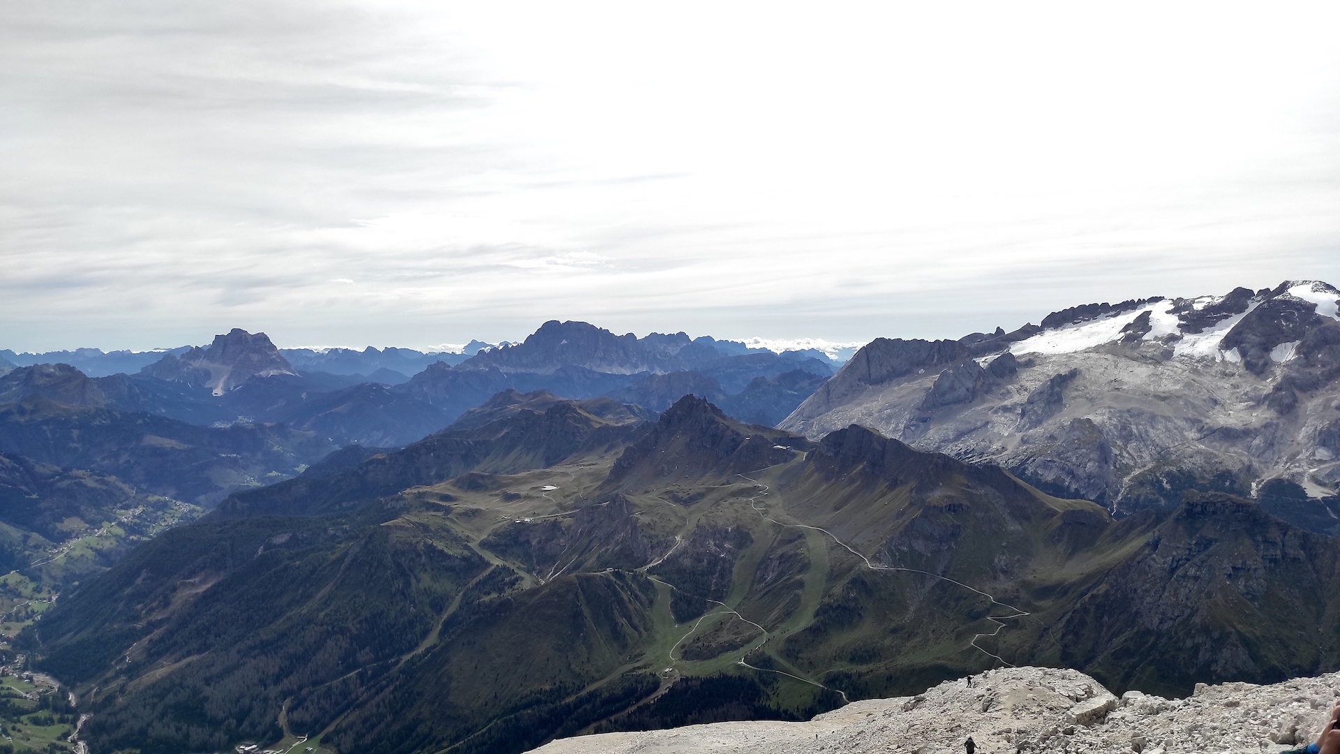 Genau auf dem Gipfel des Piz Boe steht tatsächlich eine bewirtete Hütte, die den Massenansturm, der von der Seilbahn herüberströmt, verköstigt. Das größte Rätsel aber gibt die hässliche Werbetafel auf, die unverkennbar diesen herrlichen Aussichtsberg verschandelt. Uns wird wieder einmal sehr deutlich aufgezeigt, was Seilbahn Massentourismus heißt. Dementsprechend viel „Verkehr“ herrscht auch, beim teils seilversicherten, Abstieg. Einzelheiten beschreibe ich hier lieber nicht😊.