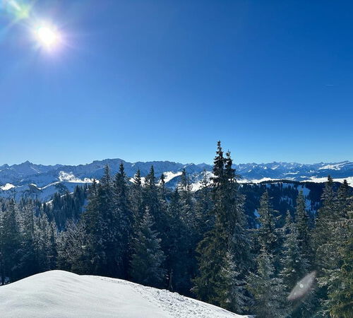 Für die erste Schneeschuhtour dieses Winters war das Wertacher Hörnle (1.695 m) unser Ziel. Das ist ein schöner Aussichtsberg der auch einen Blick ins Tannheimer Tal freigibt. Der Gipfel ist ohne größere Schwierigkeiten zu begehen. Also auch geeignet für Neulinge, die diese Art des Wintersports einmal ausprobieren wollen. Die Anforderungen an die Kondition sind mit ca. 650 Höhenmetern auch für weniger trainierte Teilnehmer im Rahmen. Zumal man sich bei dieser relativ kurzen Tour auch genügend Zeit lassen kann.