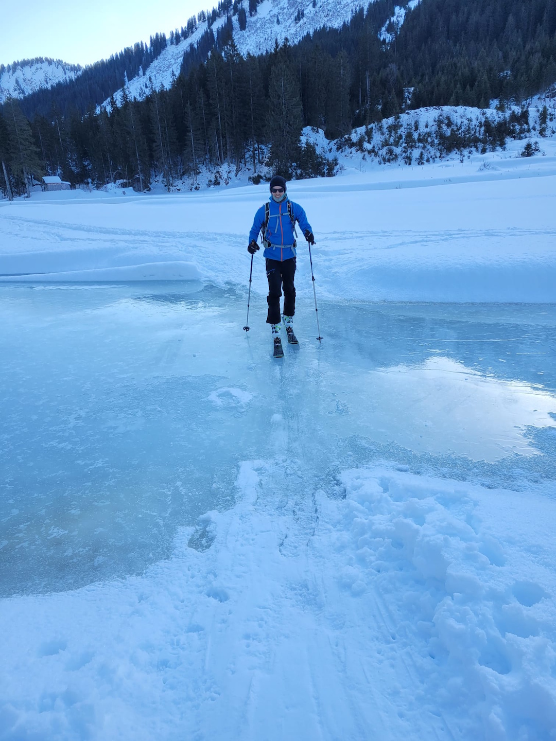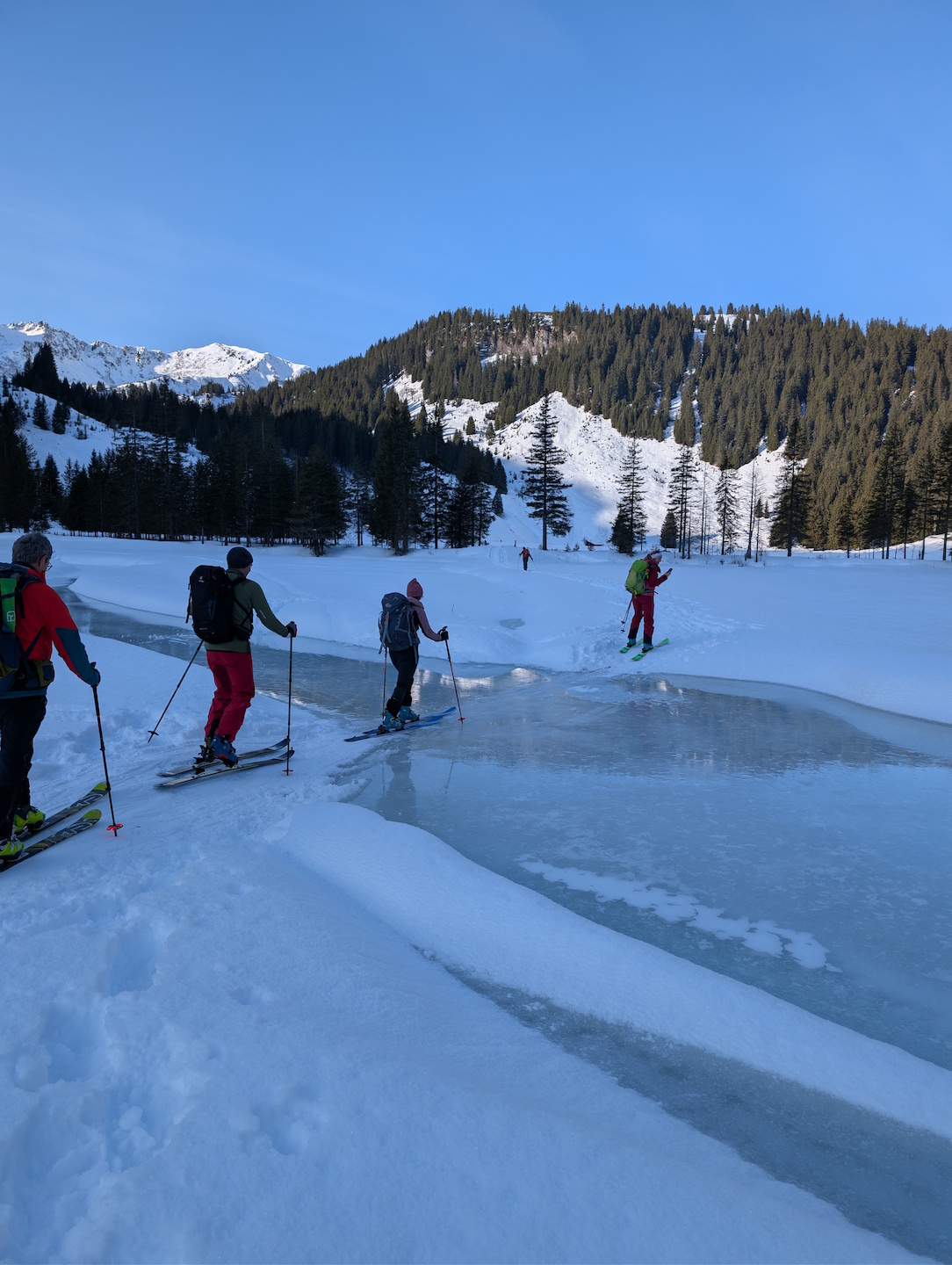 Gleich zu Beginn sorgte jedoch ein falsch eingestellter Ski für eine kurze Verzögerung und die Erkenntnis, dass ein sorgfältiger Materialcheck durchaus seine Berechtigung hat. Nach einer kurzen Schraub- und Zitterphase konnte die Tour schließlich von allen Teilnehmern aufgenommen werden.