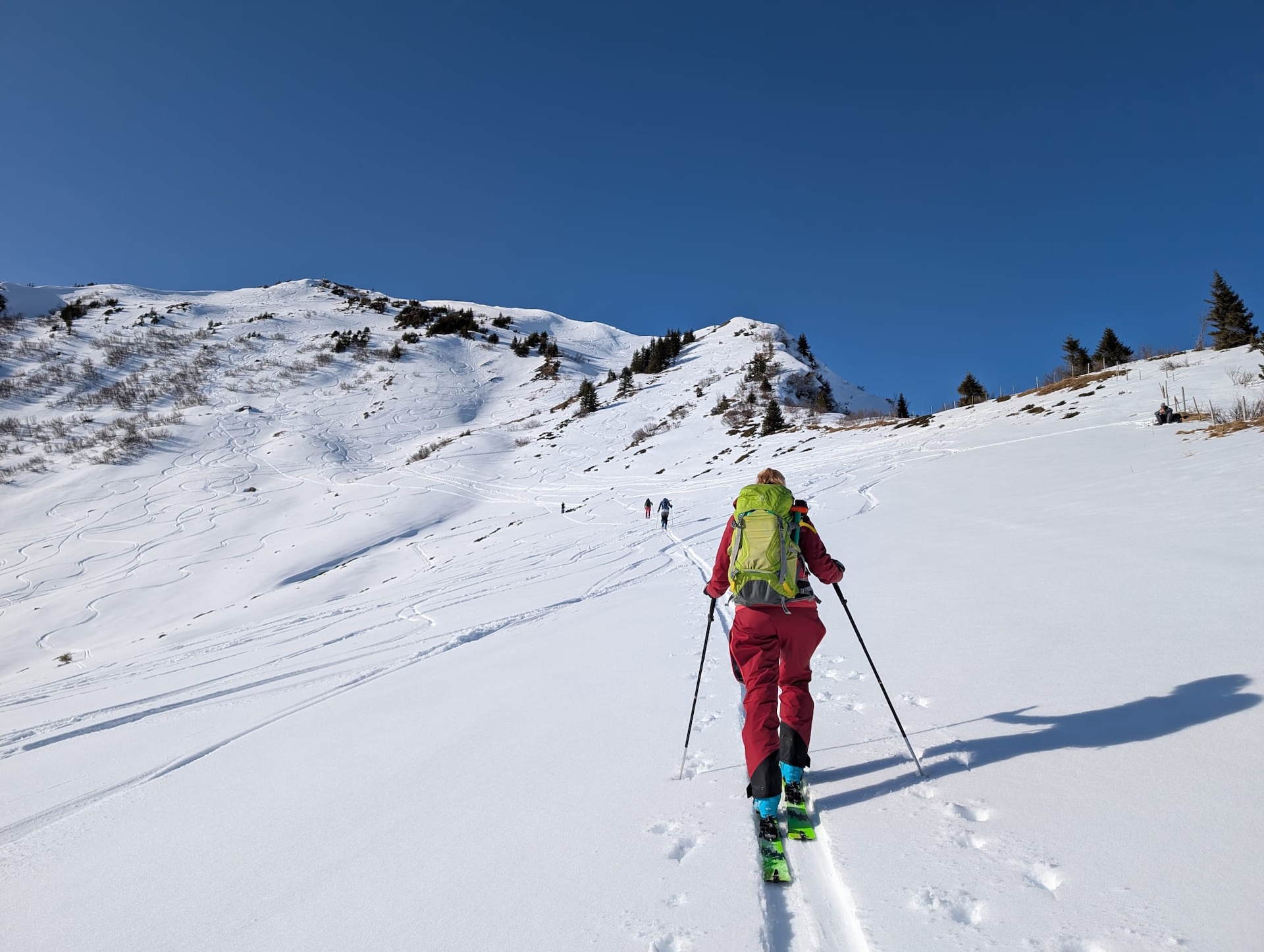 Die Schneeverhältnisse zeigten sich bei der Abfahrt unterschiedlich: Im oberen Bereich war der Schnee harschig und nicht ideal, insgesamt jedoch gut machbar - es hätte auch schlechter sein können. Im unteren Bereich fanden wir angenehmere Bedingungen vor.