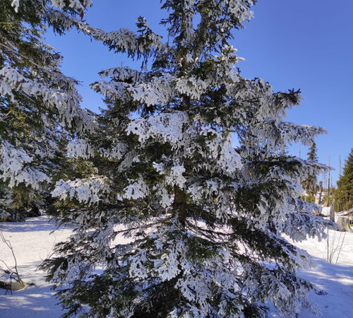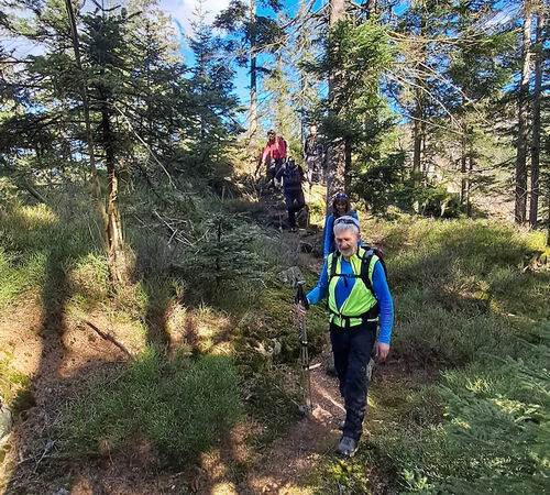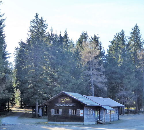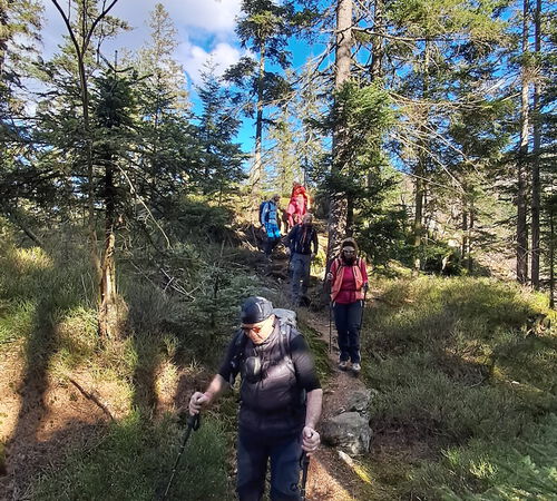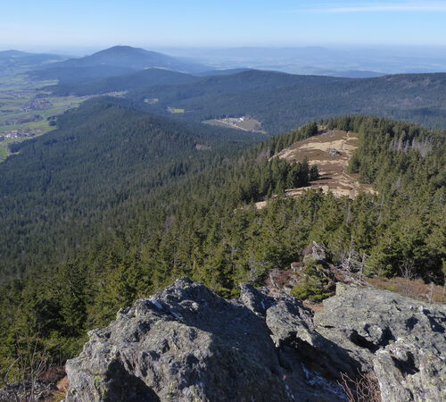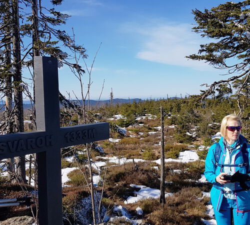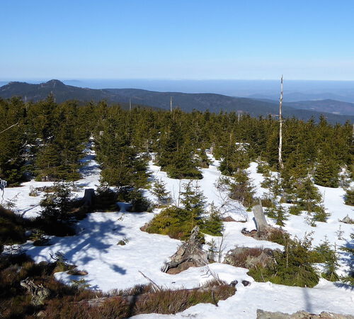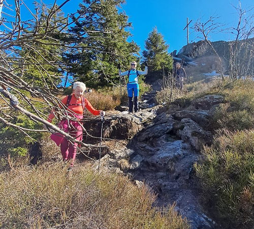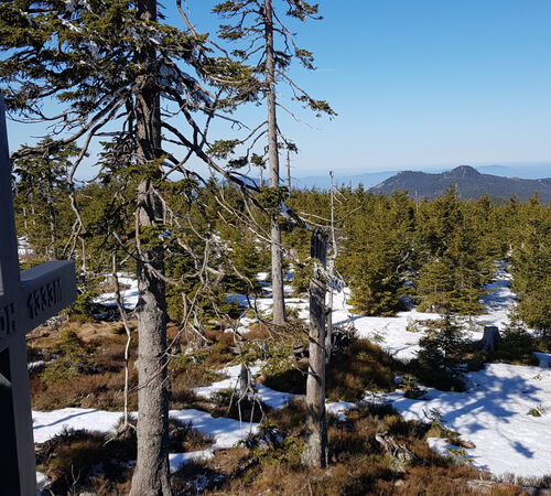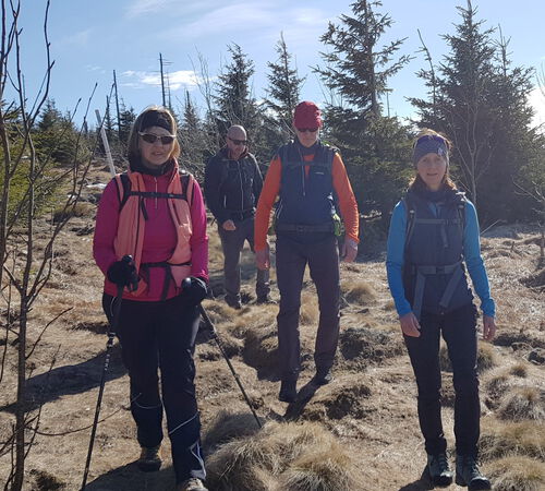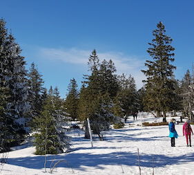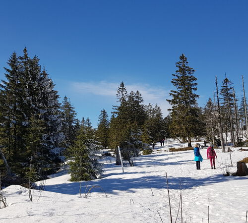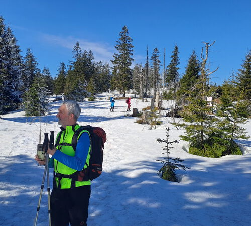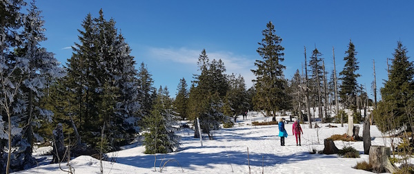 Déjà-vu am nächsten Morgen – Nebel im Tal, Sonne am Parkplatz - diesmal der an der Skiarena Hochficht auf 900 m. Ein kurzes Stück geht es den Waldweg rauf bis zum Einstieg in den Nordwaldkammweg – unsere heutige Route. Gleich zum Beginn und dann noch mehrmals quert man dabei die Skipisten, die an diesem Sonntag nicht nur gut präpariert, sondern auch gut besucht waren. Dank des disziplinierten Verhaltens aller Beteiligten kam es zu keinen Kollisionen und wir erreichen gegen Mittag den Aussichtspunkt „Stinglfelsen“. Von hier ist es nur noch ein kurzer Anstieg bis zum Hochfichtgipfel (1338m), den wir zwar ansteuern, aber kurz unterhalb Umkehren, weil er mitten im Skigebiet liegt.