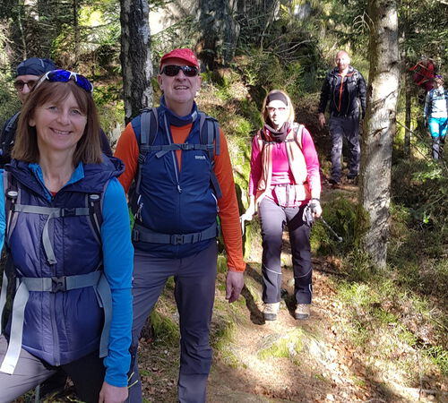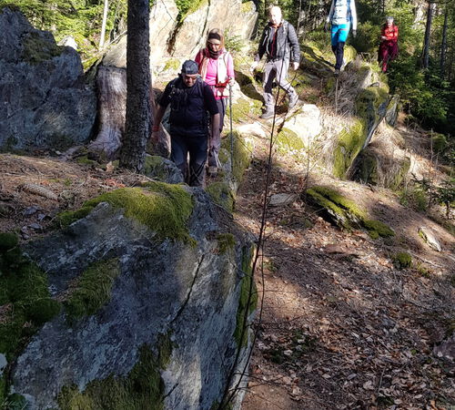 Als wir nach knapp 30 Minuten Aufstieg eine geschlossene Schneedecke unter den Füßen hatten und zu Recht die Schneeschuhe anlegen konnten, war die Freude groß. Auf dem Weiterweg zum Aussichtsfelsen „Teufelsschüssel“ waren wir fast allein und konnten die verschneite Winterlandschaft um uns genießen. Leich