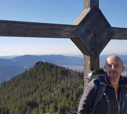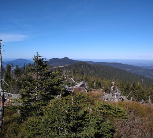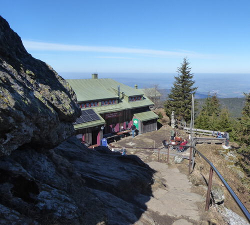 Nun ging es fast höhengleich auf dem Nordkammweg, vorbei am Bayerischen Plöckenstein in Richtung Dreisesselfelsen. Da man diesen und das gleichnamige Gasthaus bis auf wenige Höhenmeter mit dem Auto erreichen kann, war es auf diesem Abschnitt nicht mehr ganz so einsam. Bevor wir unsere reservierten Plätze zur Rast einnahmen, machten wir dem, nur 500 Meter entfernten Aussichtsfelsen Hochstein (1332m) und der Nepomukkapelle unsere Aufwartung.