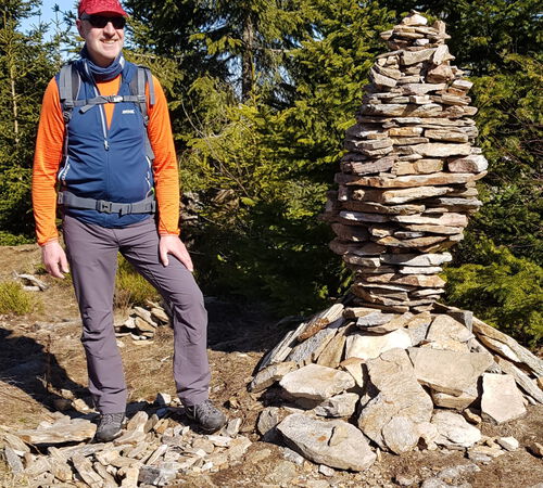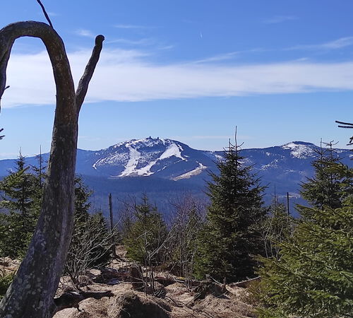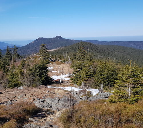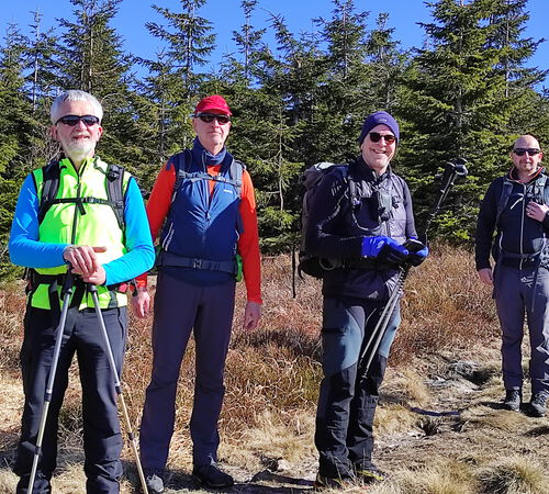Startpunkt der Tour war der Parkplatz am Scheibensattel, unweit des Großen Arber. Bei strahlendem Sonnenschein und angenehmen Temperaturen starteten wir Richtung Zwercheck (1333m), dem ersten Gipfel der Tour. War der Parkplatz (1050m) noch komplett schneefrei, wurden die Reste der weißen Pracht mit zunehmender Höhe immer mehr. Am Gipfel liefen wir dann auf einer geschlossene Altschneedecke. Wir hatten einen herrlichen Blick zum Großen Arber hinüber, an dem noch Skibetrieb war. Nordseitig war noch grober Raureif an den Bäumen, der zu fallen begann. Im weiteren Verlauf folgten wir dem Bergkamm bis zum großen Osser. Die gesamte Strecke dahin ist auch die Grenze zu Tschechien. Der abwechslungsreiche Pfad gewährte uns immer wieder schöne Aussichten auf die umliegenden Berge und Täler. Gegen Mittag haben wir den Großen Osser (1293m) erreicht. Auf dem Weg bis dahin trafen wir nur wenige Wanderer. Auf dem beliebten Gipfel ist das dann anders. Auch das Osser Schutzhaus hatte wegen des schönen Wetters vorzeitig geöffnet. Auf dem weiteren Weg bestiegen wir noch den kleinen Osser, auf den es deutlich ruhiger zuging. Hier konnten wir nochmal Blick auf den gesamten Bergkamm vom Großen Riedelstein bis hin zum Arber genießen. Der Abstieg zum Ossersattel führte uns über die Osserwiese. Dort haben einige Gleitschirmflieger die Saison eröffnet. Nach dem Parkplatz am Ossersattel wurde es nochmal interessant. Von dort folgten wir einem schmalen Pfad, der uns genau den Bergkamm entlang führte. Immer wieder galt es felsige Bereiche zu meistern. Bei der Kapelle Maria Hilf endete der Weg, und wir stiegen ab nach Lam, das wir nach gut 6 Stunden erreichten.