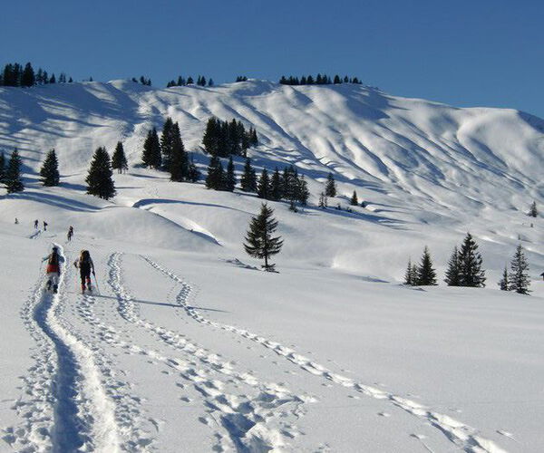 Mittelschwere Schneeschuhtour (ca. 700 Hm) auf einen herrlichen Aussichtsgipfel mit Blick zum Allgäuer Hauptkamm und das Gottesackerplateau am Hohen Ifen.